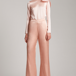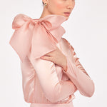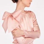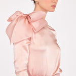 Silk Satin Button and Bow Embellished Blouse with Long Sleeves in Blush Pink
