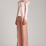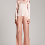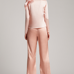 Sumptuous with endless romantic elan, the Silk Satin Button and Bow Embellished Blouse with Long Sleeves in Pink is characterized by its minimalist shape and oversized shoulder bow all in a luxurious silk base fabric. The silk satin fabric of the blouse is clean and unembellished except for button openings on both shoulders on which the silk gazar bow can detach or attach on either side according to your preference. Team yours with some high-rise black pants for a polished finish or our crystal fringe embellished skirt for a charming evening look.