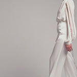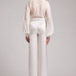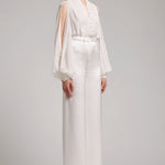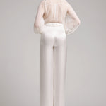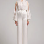 Cut from luxurious and lustrous silk chiffon, the Ruffle Trimmed Batwing Blouse in White exhibits a feminine design with an entrancing polished finish. Its high neckline is framed by delicate ruffles can be unbuttoned to reveal the perfect amount of décolletage while the sheer slitted sleeves flare out from the shoulder to its ruffle detailed cuffs. The top is versatile to go with an array of styles – wear yours with black pants for sleekness or tailored shorts for your more casual affairs.
