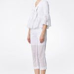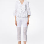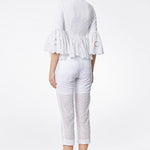 The Broderie Cotton Bow Embellished Peplum Top is a fail-proof sartorial choice for any casual day out. The top is light, airy and entirely snow white which makes it minimalist and so comfortable to put on yet is completely adorned in broderie anglaise embroidery, making it far from plain. It features a modest V-neck that is practical and dips into a harmonising bow as well as a set of unlined breezy bell sleeves and peplum cut for added flair.