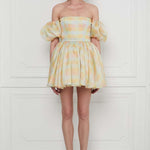 Simply precious, the Checkered Print Puffed Sleeves Silk Gazar Dress has a perky silhouette consisting of puffed elasticated sleeves and a shorter length. While the billowy skirt calls attention to the piece, remaining details are rightfully complementing such as the flattering off shoulder neckline framing the décolletage and its fitted bodice that contrasts with the volume of the skirt for figure flattering effect. Charm your crowd by pairing it with some delicate t strap pumps.