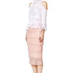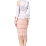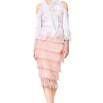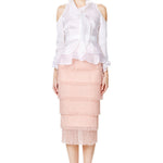 Naturally feminine, the White Silk Gazar Cold Shoulder Belted Top makes dressing up feel extra special. Cut from lightweight silk gazar, the lustrous piece is adorned with soft ruffles at the neckline, gathered cuffs, centre opening and tiered hem for a tender romantic look. The silhouette features a cold shoulder design and is neatly darted and belted to highlight your narrowest point. Complement the flouncy frills with a pair of body-skimming bottoms.