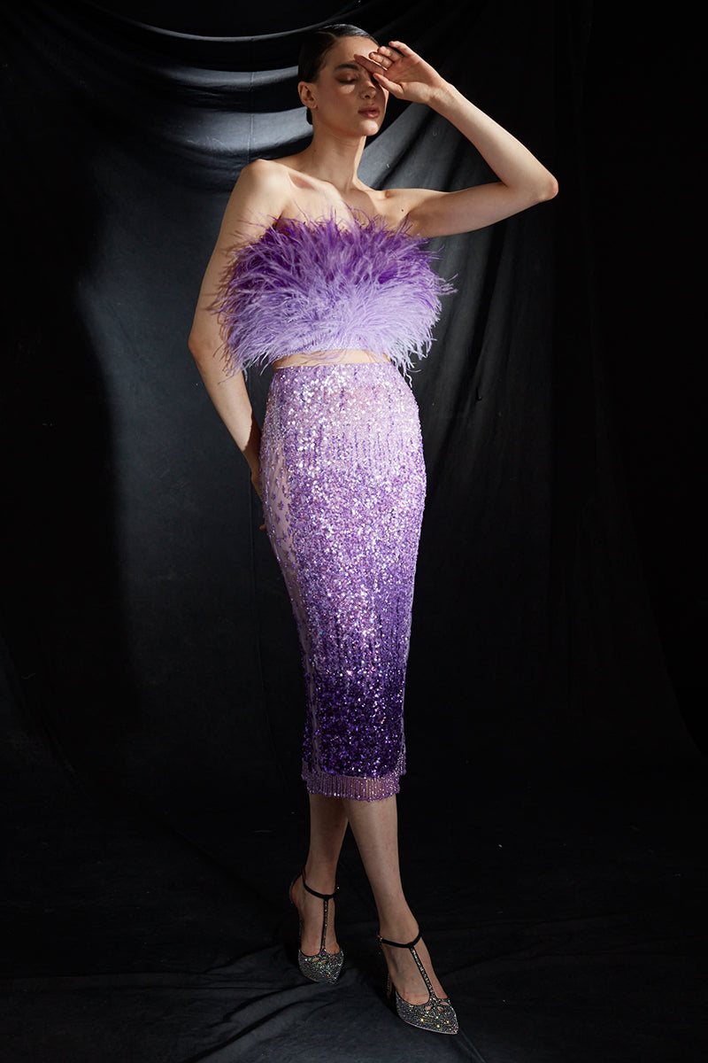 Embroidered Mesh Midi Skirt with Crystal Fringe in Gradient Amethyst Purple