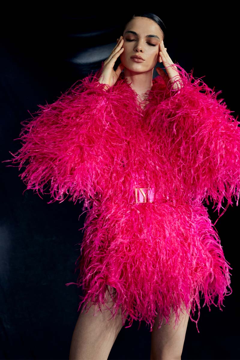Ostrich Feather Embellished Double Breasted Coat in Raspberry Red with Logo Belt