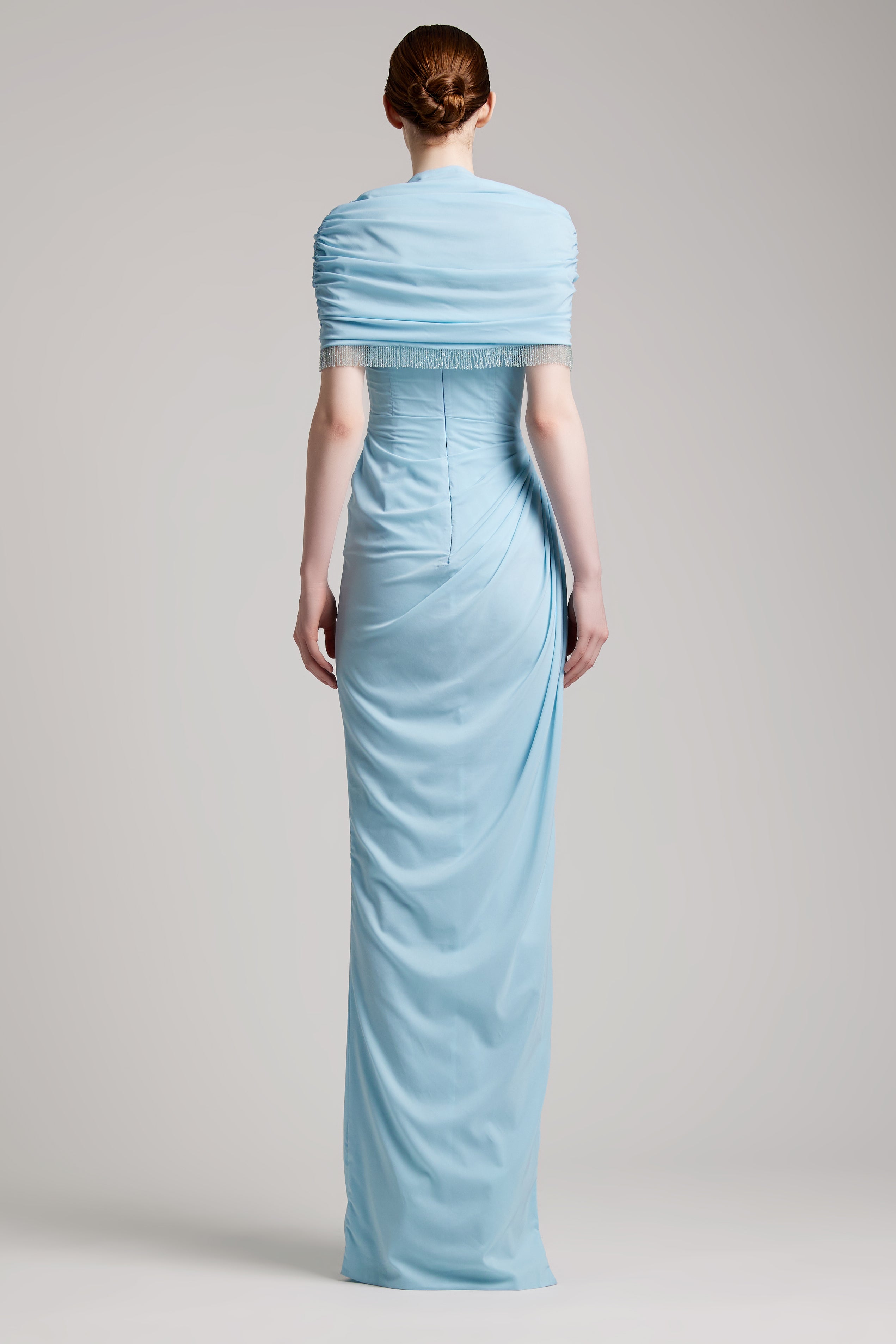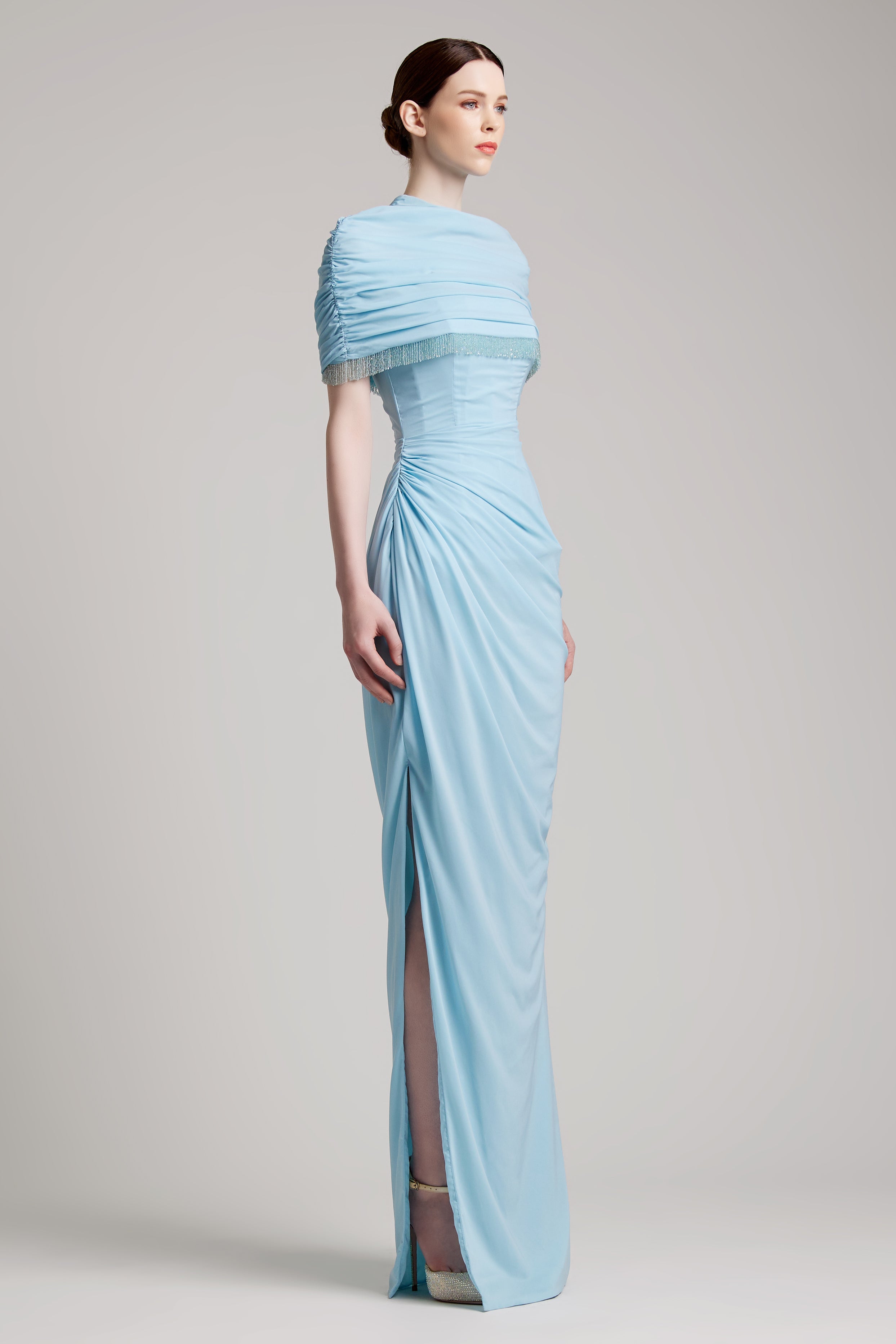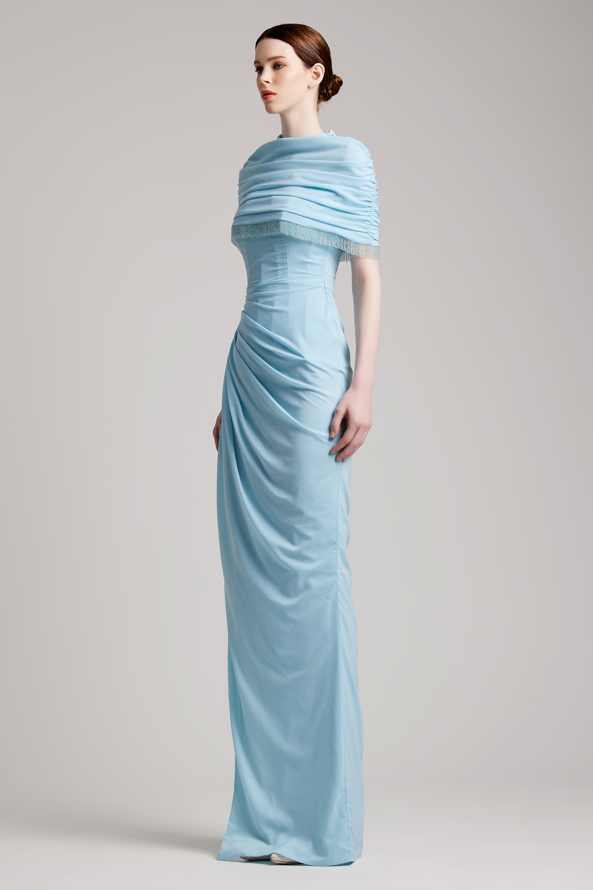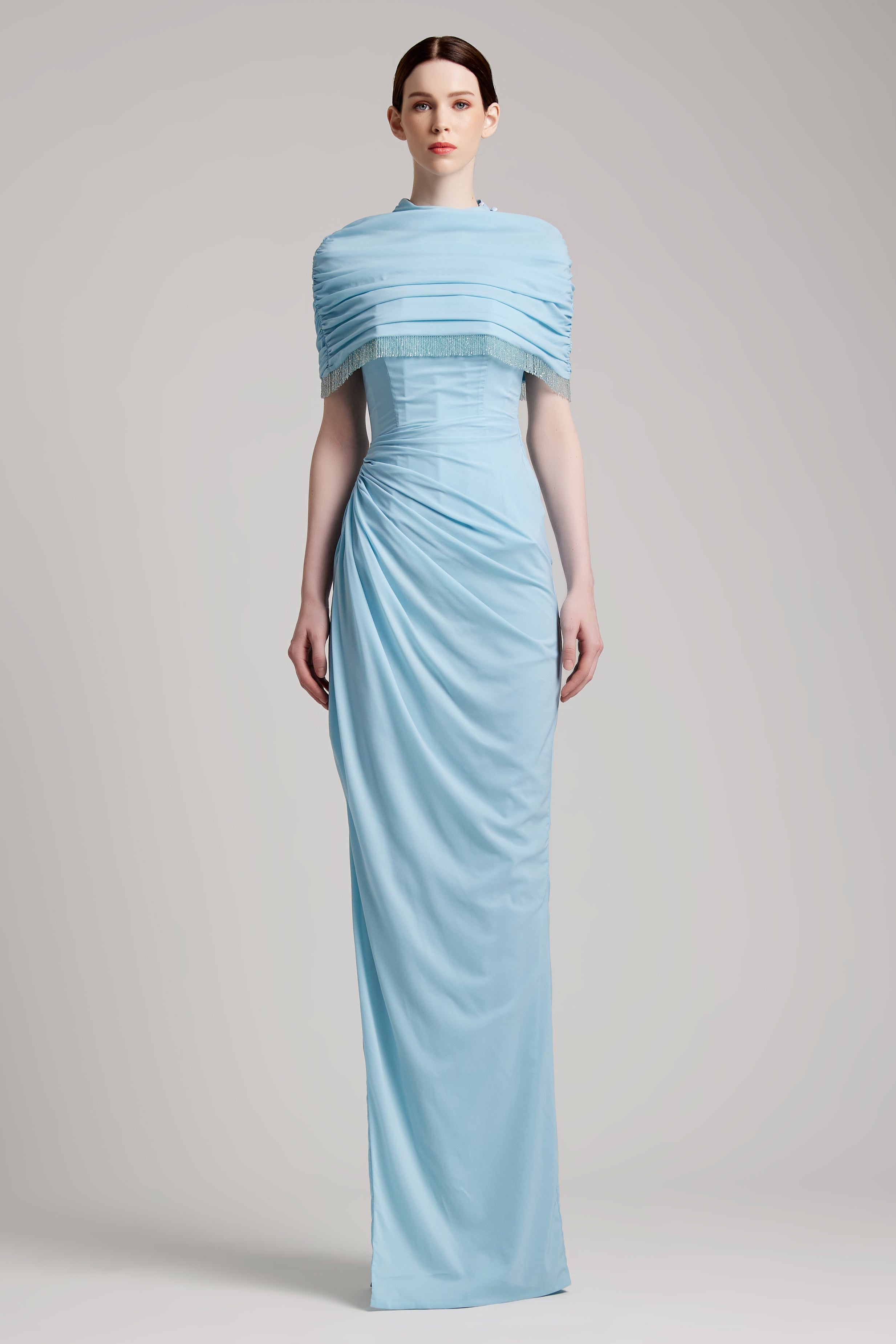 Elastic Corset Gathers Dress with Glass Beads Shoulder Cape in Baby Blue