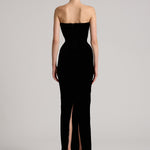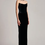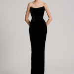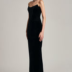 Scoop Neckline Silk Velvet black gown is made from luxurious silk velvet, giving it a rich and smooth texture.