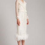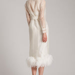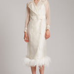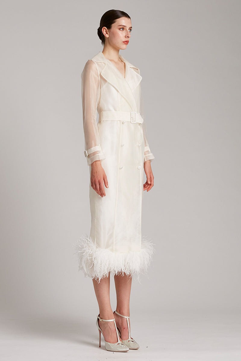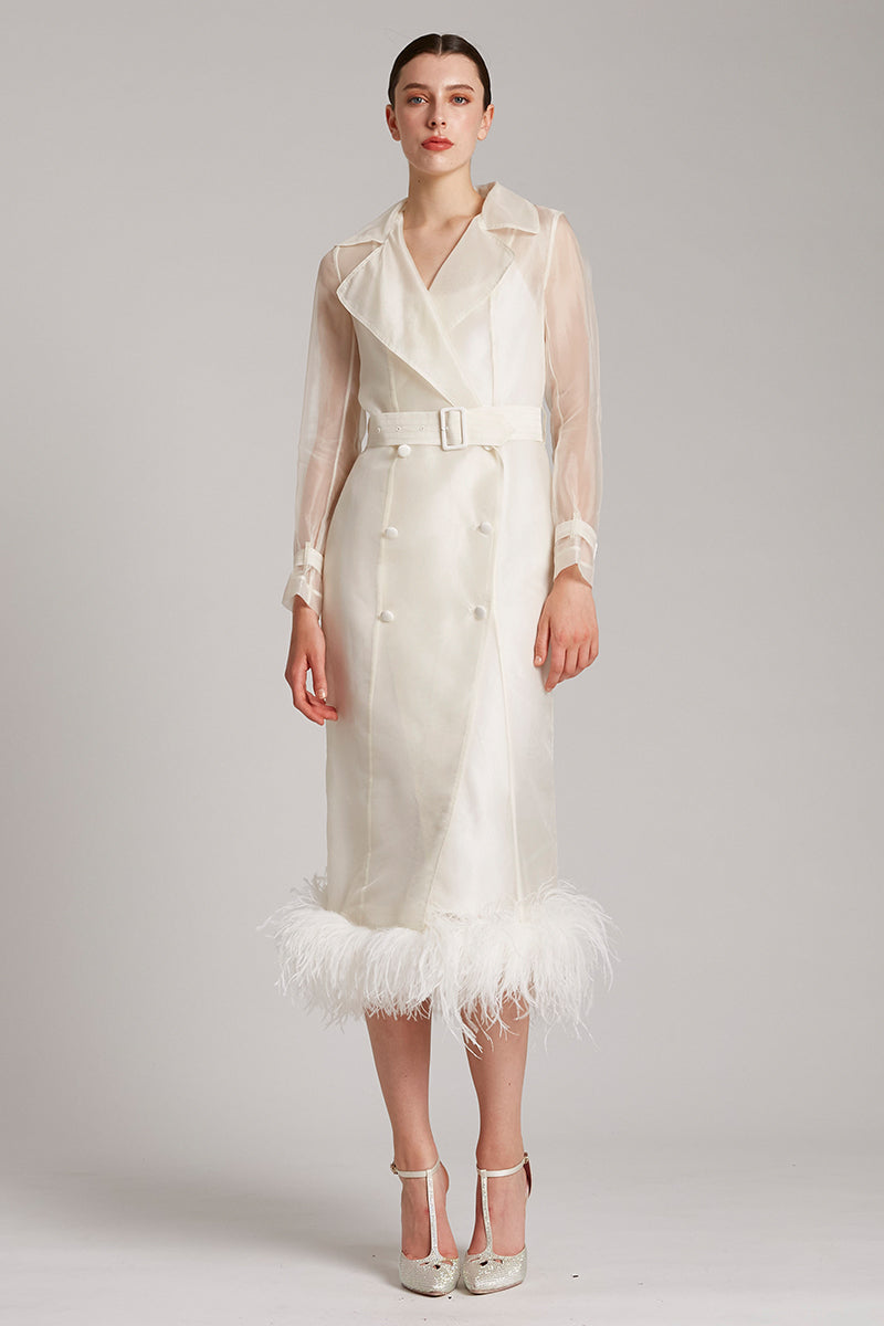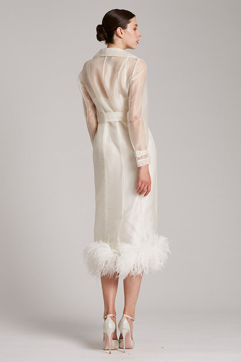 Ostrich Feather Embellished Silk Gazar Slim Midi Trench Dress in White