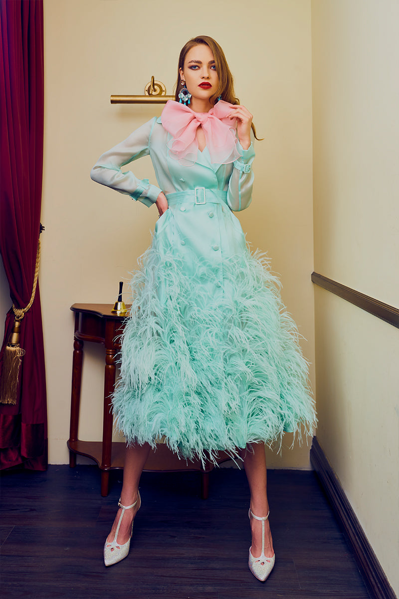 Sophisticated and ethereal, the Silk Gazar Ostrich Feathers Embellished Trench Coat in Mint Green is smooth to the touch and portrays a supple appearance thanks to its lightweight silk gazar base fabric. The voluminous ostrich feathers embellishment renders the coat decadent yet allows polished notions to peek through, giving rise to a piece that demands all the attention. Put on its accompanying silk belt and wear it as is or drape it over your favourite day or night time ensemble.