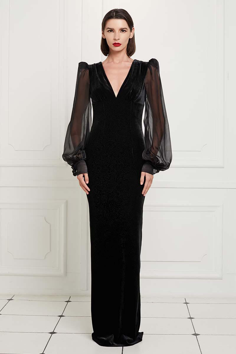Silk Velvet Full Length Gown with Puffed Silk Chiffon Sleeves in Black