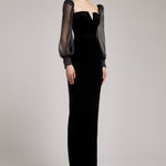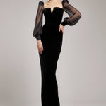 Sumptuous with endless romantic elan, the Silk Velvet Top with Puffed Silk Chiffon sleeves in Black is characterized by its long dramatic sheer balloon sleeves and plush texture from its luxurious silk velvet base fabric. The bodice is structured with a notch at the neckline for a peek of your decolletage and allows for both regular and off-shoulder wear of the sleeves which are sheer for an understated sultry accent to the piece. Team yours with some high-rise black pants for a polished finish or the coordinating velvet skirt for a charming evening look.