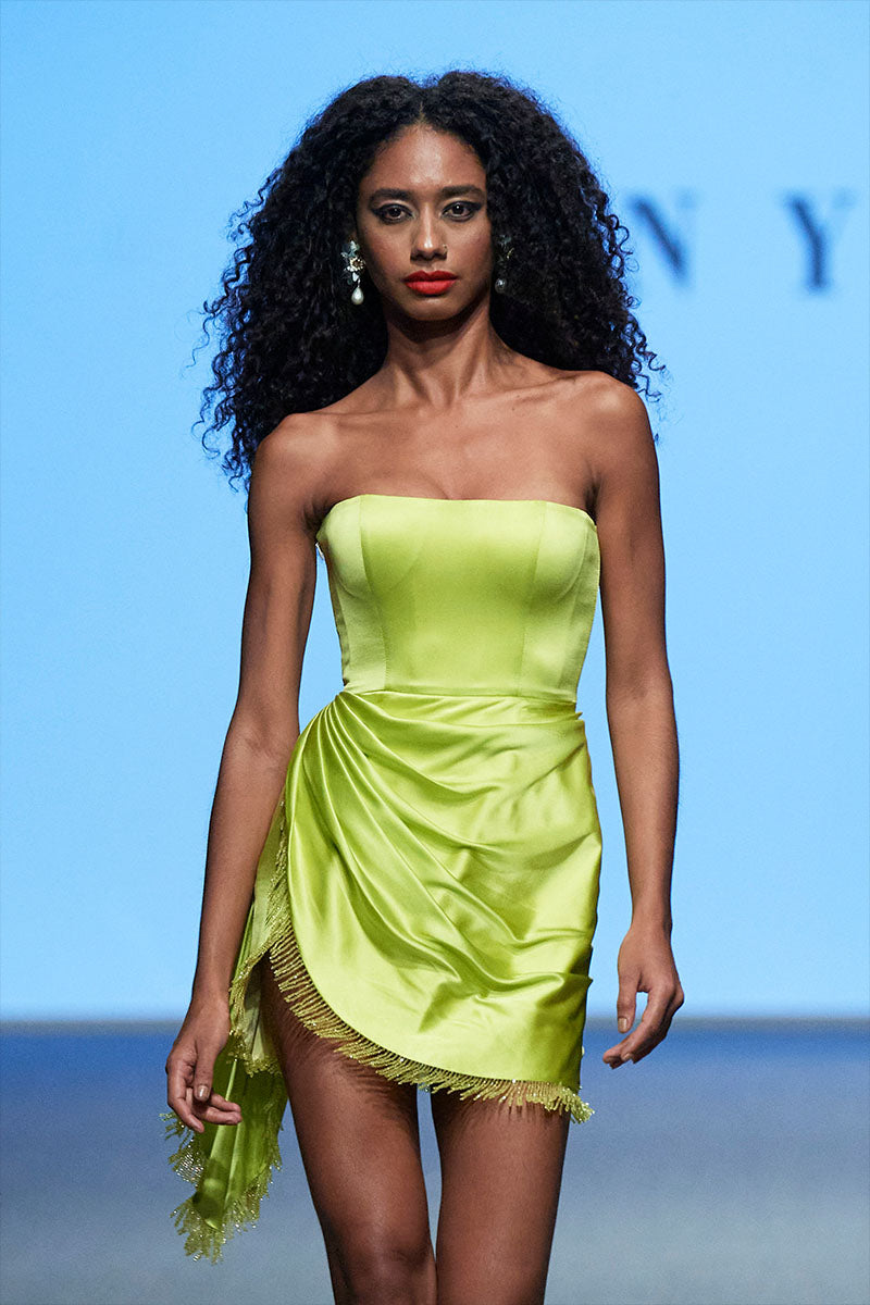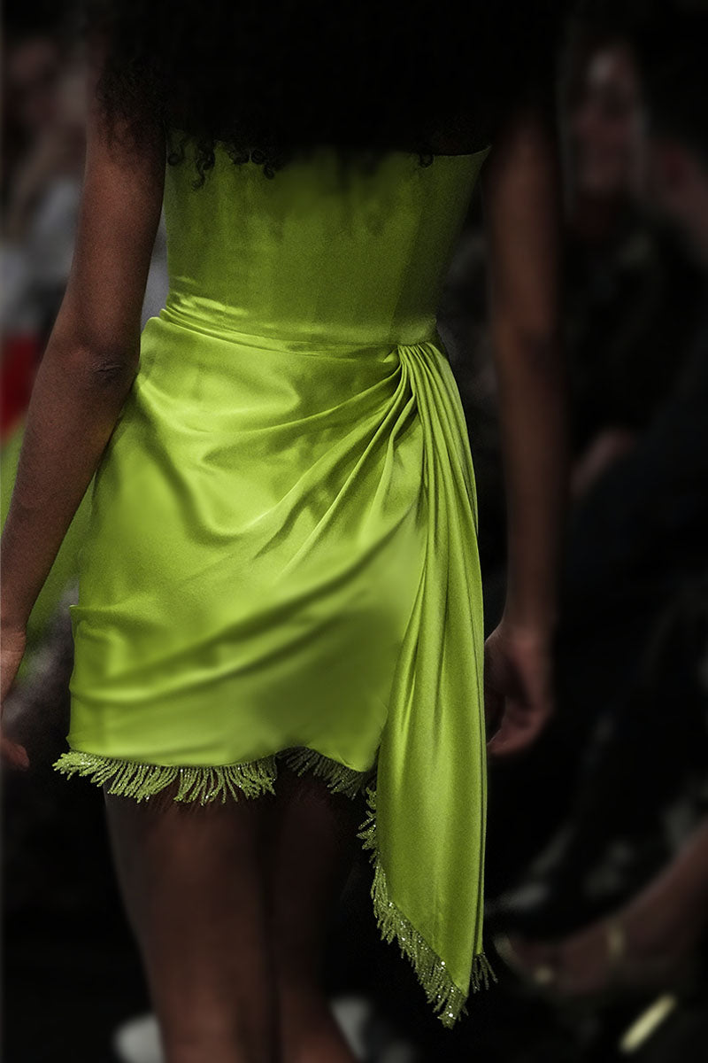 Strapless Side Ruched Silk Satin Mini Dress with Crystal Fringe in Limelight Green