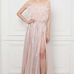 There is no better way to describe the Ostrich Feather Embellished Strapless Top in Light Pink than coining it flamboyantly fabulous. The top features a gorgeous yellow hue and individually embroidered on plush ostrich feathers to bring you a carefree and lavish quality. Sitting just above the waist, its full appearance accentuates the bust while giving rise to an illusion of a slimmer waist.