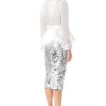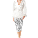 Chic and dressy, the Ostrich Feathers Embellished Silk Gazar Coat in White features a distinctive pair of rested lapels that dip into a plunging neckline before an accentuated shoulder lining and double-breasted style to make for a highly sophisticated look. The boxy form is ultimately balanced out by an accompanying silk belt and wholly embellished with luxuriant ostrich feather peplum cut at the waist for a sumptuous finish and an all in all more flattering and feminine silhouette. Wear this commanding piece to any event that calls for a smart casual dress code with your favourite pencil skirt.