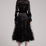 Sophisticated and ethereal, the Silk Gazar Ostrich Feathers Embellished Trench Coat in Black is smooth to the touch and portrays a supple appearance thanks to its lightweight silk gazar base fabric. The voluminous ostrich feathers embellishment renders the coat decadent yet allows polished notions to peek through, giving rise to a piece that demands all the attention. Put on its accompanying silk belt and wear it as is or drape it over your favourite day or night time ensemble.