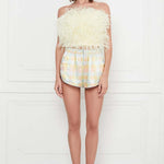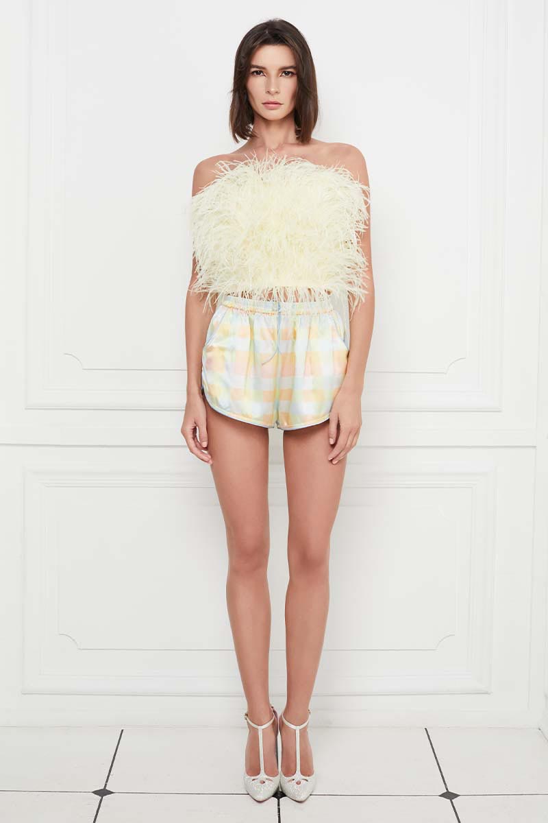 Reminiscent of retro running shorts, the Checkered Print Silk Satin Shorts is a top choice for both lounging around at home and day outs. Made from luxurious and lustrous silk satin, the piece is ultra-sensuous and feels extra soft on the skin and is accompanied by a delicate contrast piping for an added touch of daintiness. The waistband is elasticated for comfortable support. Throw on an oversized tee and some heels for the ultimate off-duty look.