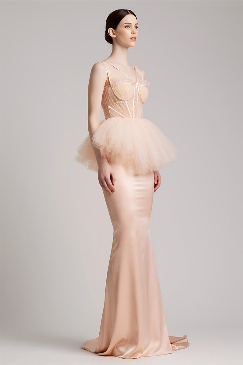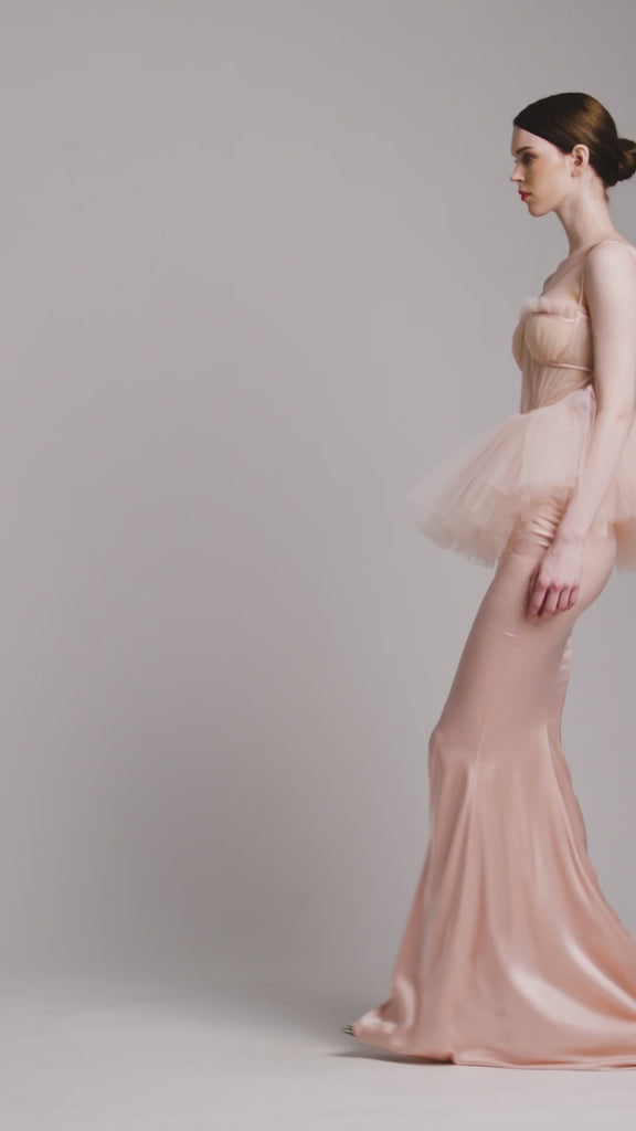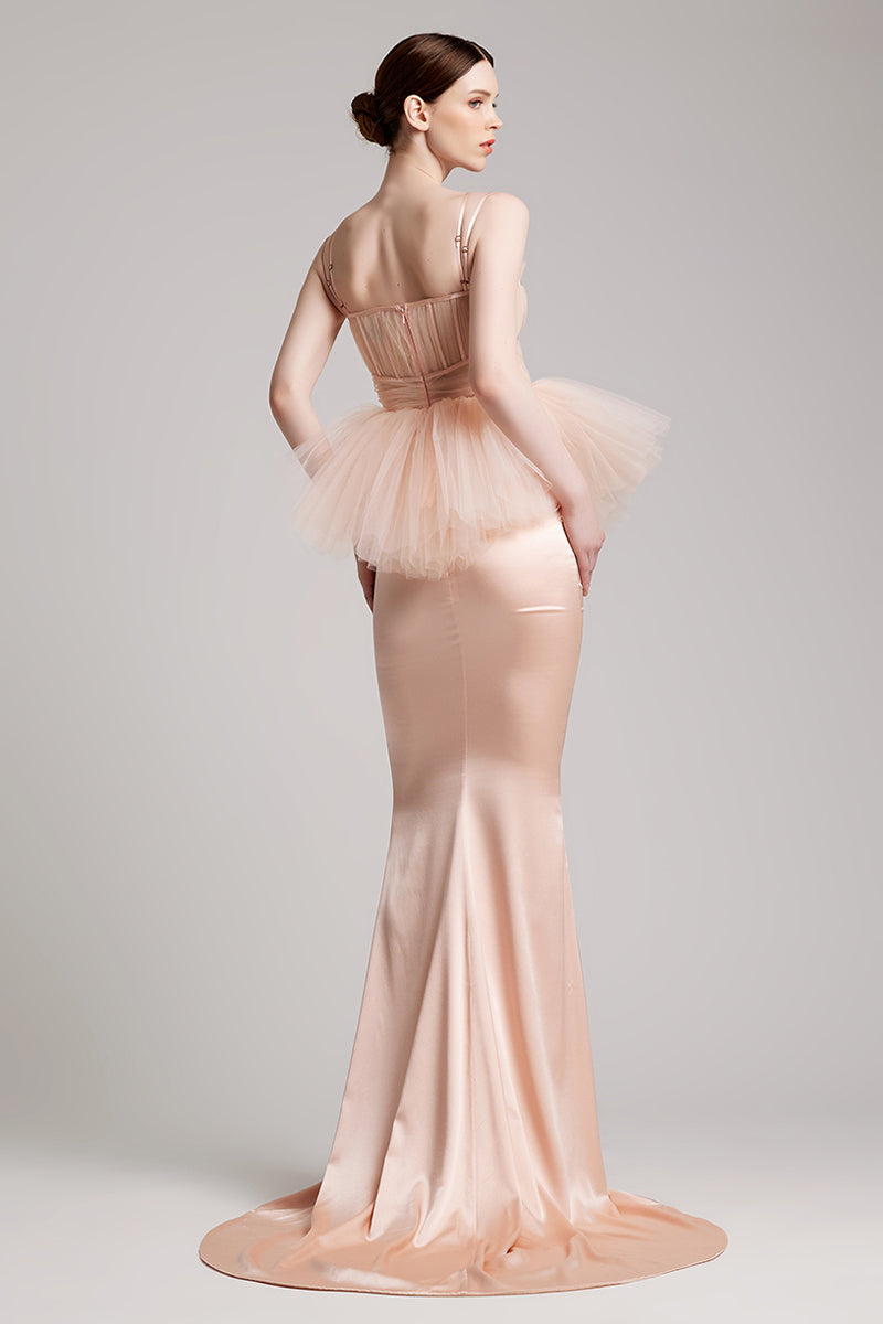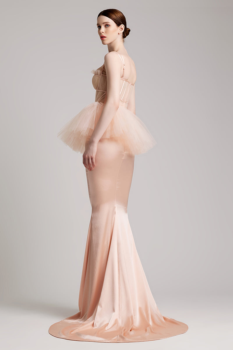 Elevate your style with our Blush Pink Bustier Peplum Tulle Top. Adjustable straps and bra padding ensure a perfect fit, while the structured bodice flatters your figure. The whimsical peplum adds flair. Pair with a silk satin trumpet skirt for red carpet elegance or long straight pants for a casual affair. Conceals tummy insecurities on bloated days. Flaunt versatility with confidence.