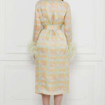 Checkered Print Ostrich Feather Embellished Sleeves Silk Gazar Trench Coat