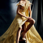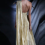 Feather Embellished Draped Bodice Front Double Slit Gold Line Silk Chiffon Dress in Gold