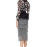 Poise with feminine accents all-around, the Hand Embellished Mesh Top With Ostrich Feathers Peplum in Black possesses a body of dainty silver-toned floral embroidery and a flattering square neckline that beautifully frames the décolletage. The feminine allure is further emphasised through cinching at the waist with a lustrous silk satin belt and wholly embellished ostrich feather peplum cut. This piece can be dressed up with some dressy bottoms or kept casual with a pair of second skin jeans.
