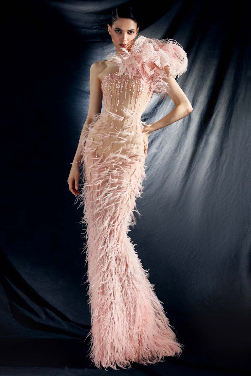 Ostrich Feather Embellished Mesh Dress in Blush Pink