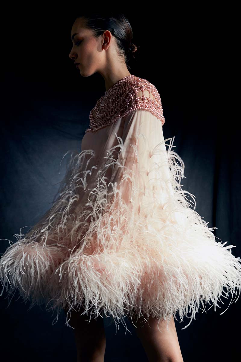 Ostrich Feather Embellished Pearl Mini Tent Dress in Blush Pink