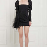 A dressy piece with a majestic flair, the Ostrich Feather Embellished Trail Mini Dress is undeniably sleek with smooth wrapped appearance but at once ornate to include a lush ostrich feather trail and elegantly puffed sleeves that can be worn on or off shoulder. The bodice is draped and gathered down to the waist, and this extends to the hips in an asymmetrical and magnificently lustrous manner, adding a pop of contrast to the seemingly monotonous palette.