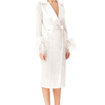 Embodying elegance with a tinge of drama, the Ostrich Feathers Embellished Sleeves Silk Gazar Trench Coat in White is truly a delicacy to get dolled up in. The piece is lightweight and features a luxurious smooth finish thanks to its silk gazar base fabric, which coexists seamlessly with the exquisite ostrich feather embellished cuffs that spruce up the entire design most optimally. With both the ostrich feather cuffs and silk belt being detachable, style this versatile piece as you please such as wearing it as is with a simple slip dress underneath or leaving out the additional parts to layer it over your go-to day or night time ensemble.