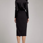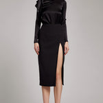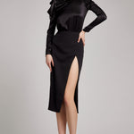 A classic black pencil skirt with elevated details, the Beaded High Waisted Side Slit Skirt in Black is chic, luxurious and far from plain. No doubt a minimalist design, the skirt nonetheless boasts details that set it apart such as the embroidery on its pockets and side seams of subtle and dainty glass beads, and the slit on the left that creates an illusion of a wrap-effect style for a lavish touch. It sits high on the waist and drops to the knee to frame your curves. Wear it with a blouse for a minimalist look or take it up a notch with a feather embellished coat.