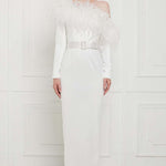 Ostrich Feather Trimmed Asymmetrical Gown in White is a truly a vision in white thanks its pristine colorway that works so well to draw all eyes on you. The minimalist gown has a long-sleeved form fitted silhouette that is ultra-chic and clean. The focal point of the gown is the asymmetric off shoulder neckline with voluminous ostrich feathers in pure white as the sole defining embellishment. The floor length columnar skirt creates a flattering illusion of endless length, especially enhanced when paired with your favorite sky-high heels.