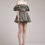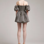 Houndstooth Print Puffed Sleeves Silk Gazar Mini Dress