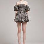 Simply precious, the Puffed Sleeves Silk Gazar Dress in Houndstooth Print has a perky silhouette consisting of puffed elasticated sleeves and a shorter length. While the billowy skirt calls attention to the piece, remaining details are rightfully complementing such as the flattering off shoulder neckline framing the décolletage and its fitted bodice that contrasts with the volume of the skirt for figure flattering effect. Charm your crowd by pairing it with some sparkly pumps.