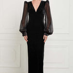Silk Velvet Full Length Gown with Puffed Silk Chiffon Sleeves in Black
