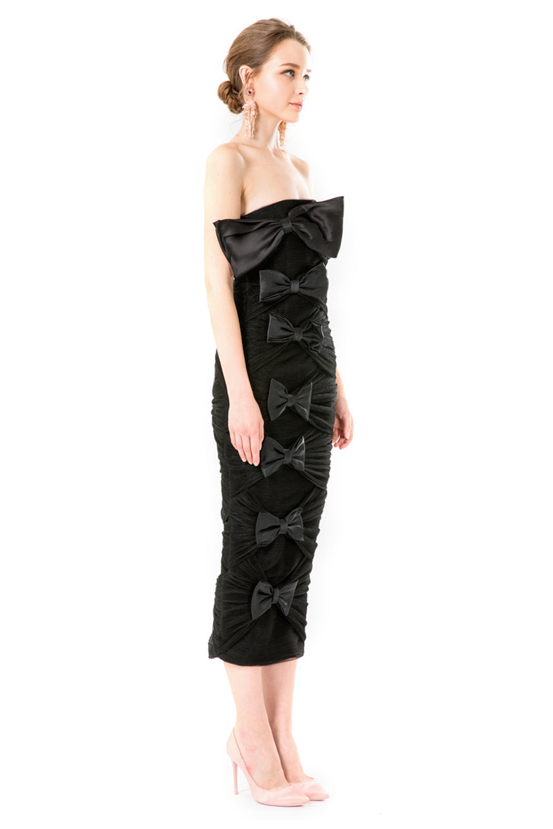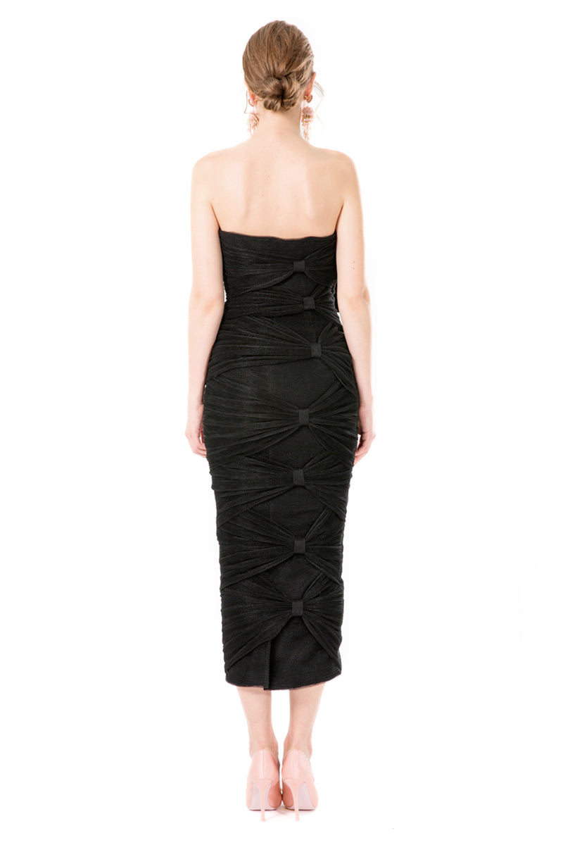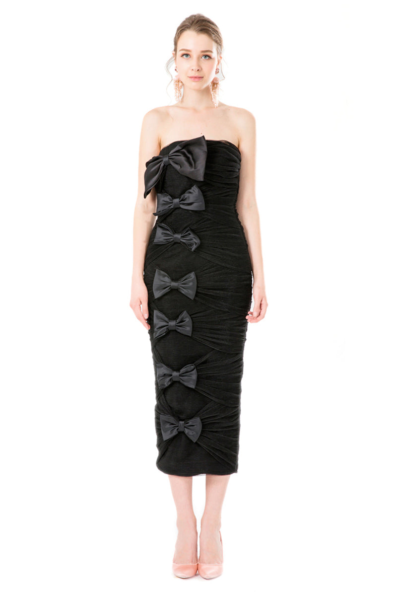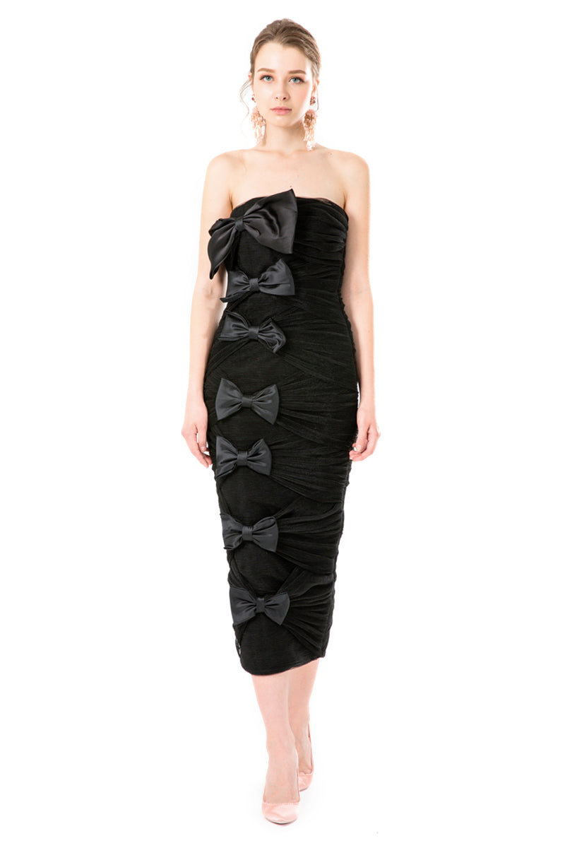 The Silk Gazar Ribbon Embellished Draped Tulle Strapless Dress in Black was crafted for the ultimate standout look. The piece oozes all-around feminine appeal with its bodycon silhouette to outline your figure and features ruching throughout with draped tulle for further flattery. The column of lustrous silk gazar ribbons trace the front gathers to sit nicely on your right, broadcasting a statement and the dress’ intrinsic feminine elan.