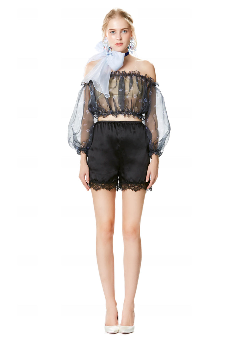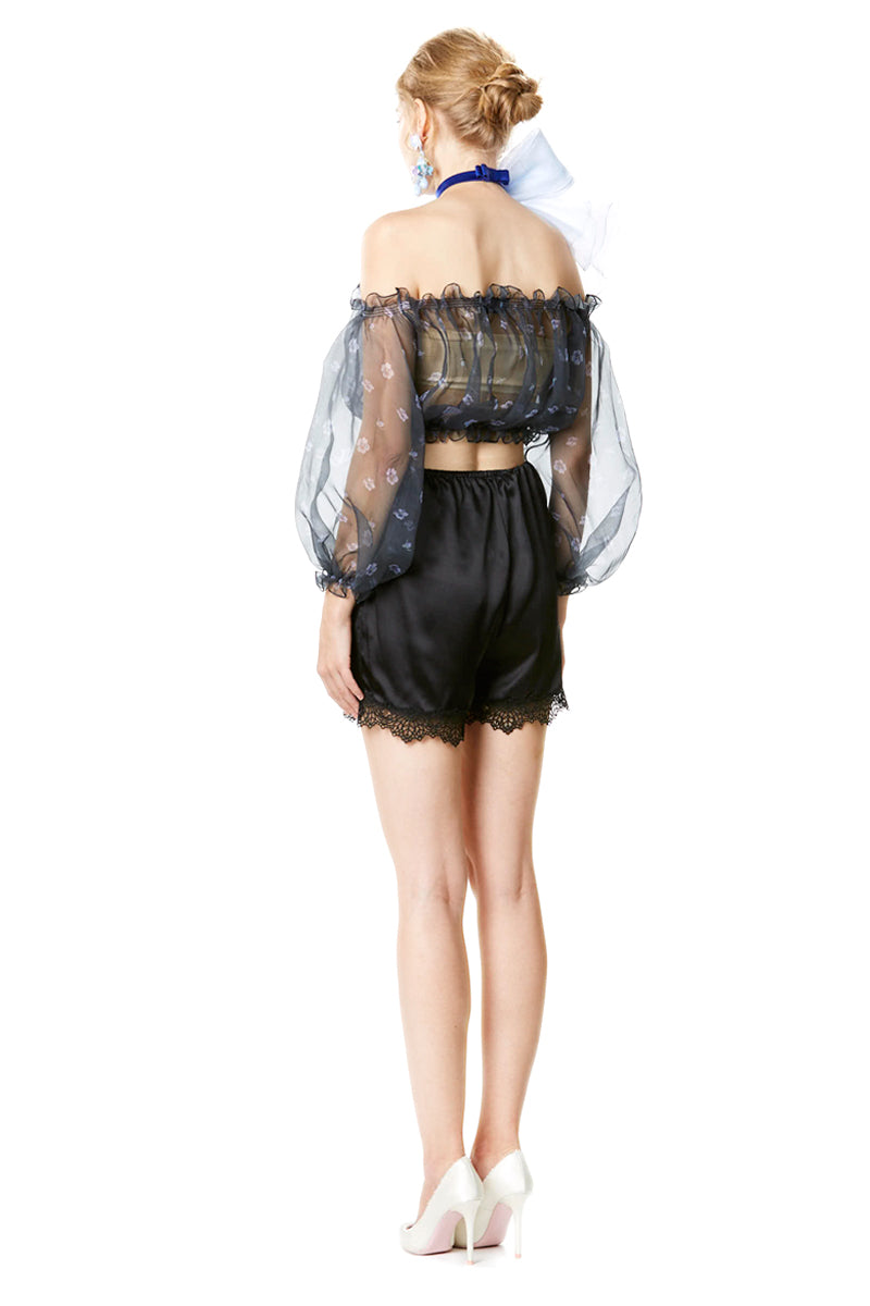Silk Organza Elastic Band Off Shoulder Crop Top in Black