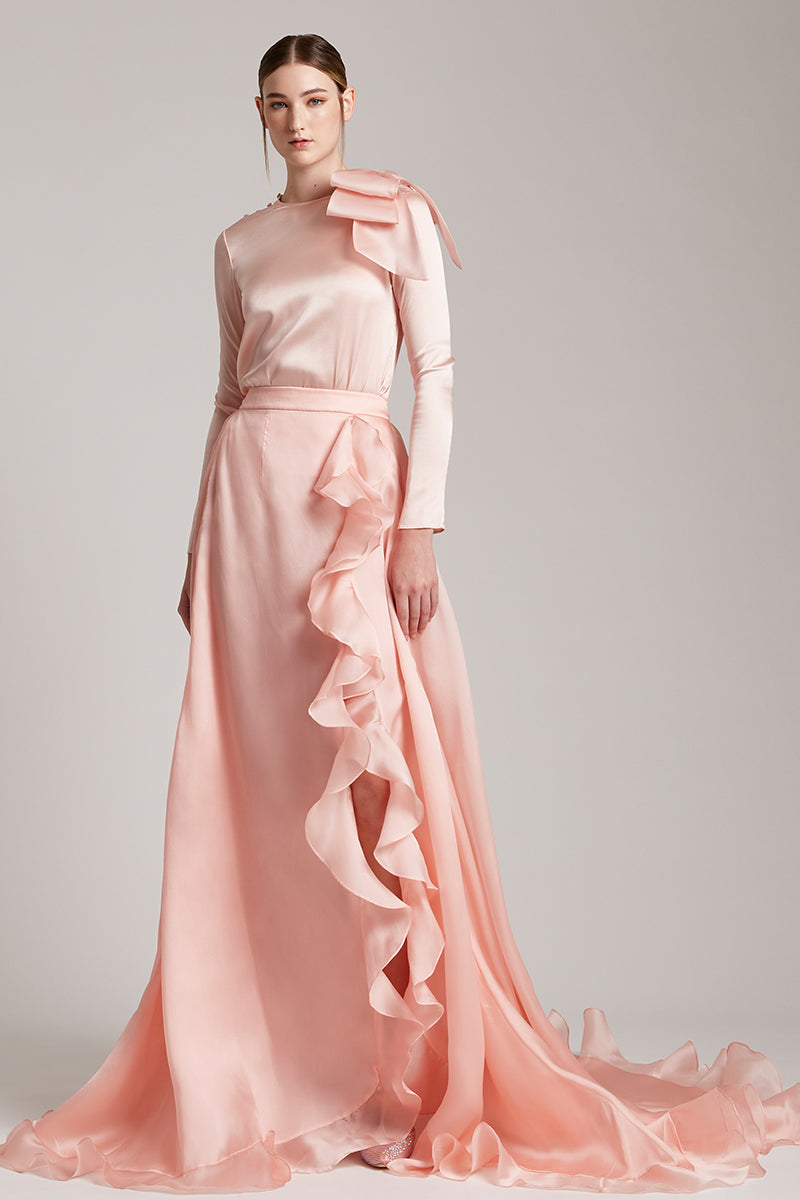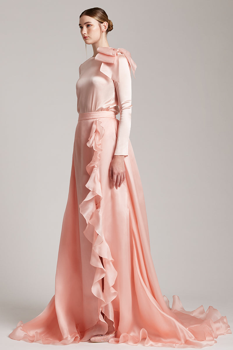 Silk Gazar Ruffles Side Slit Maxi Skirt in Pink
