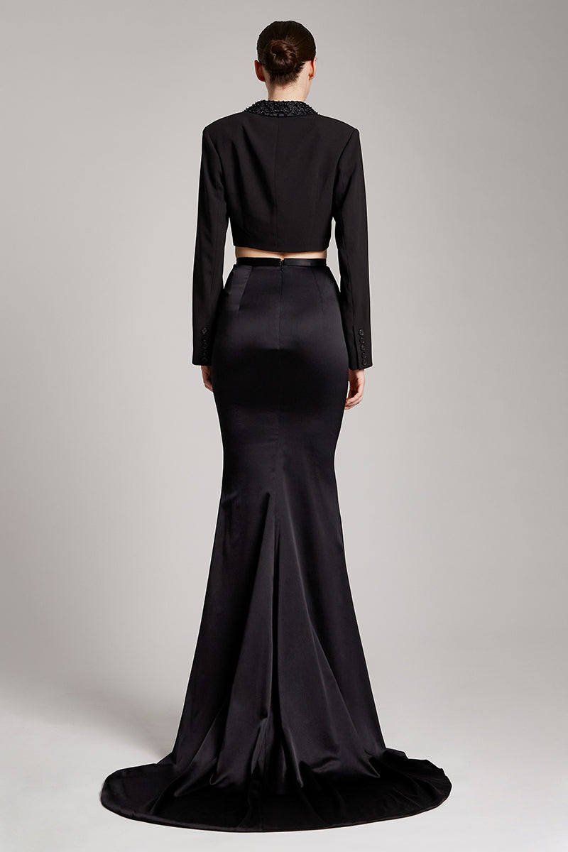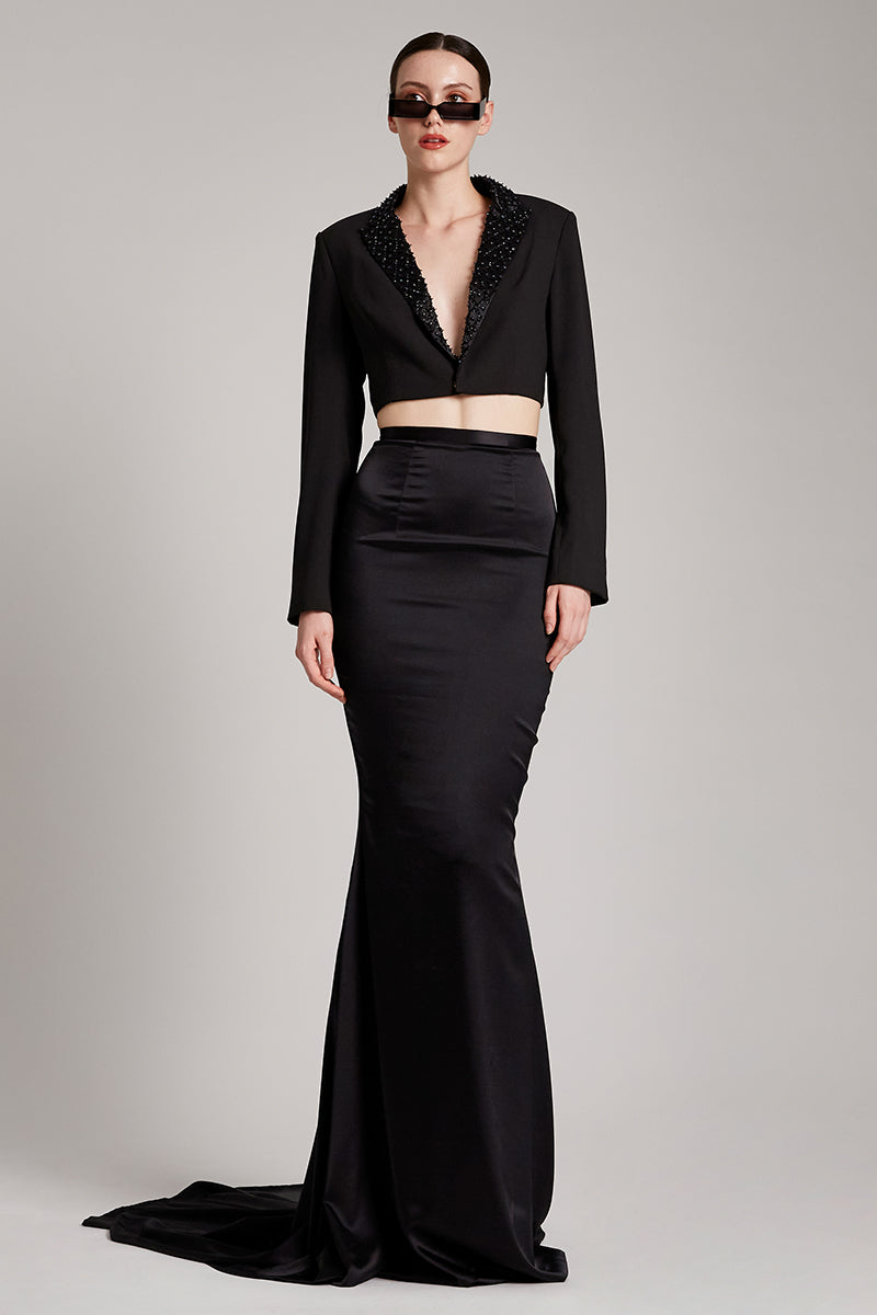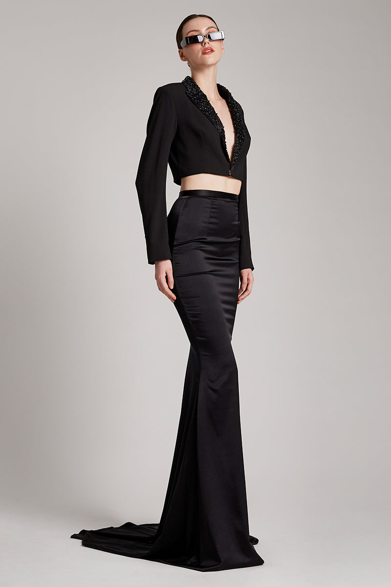 Silk Satin Trumpet Skirt with Train in Black