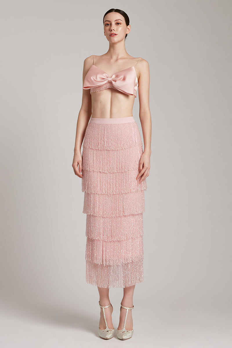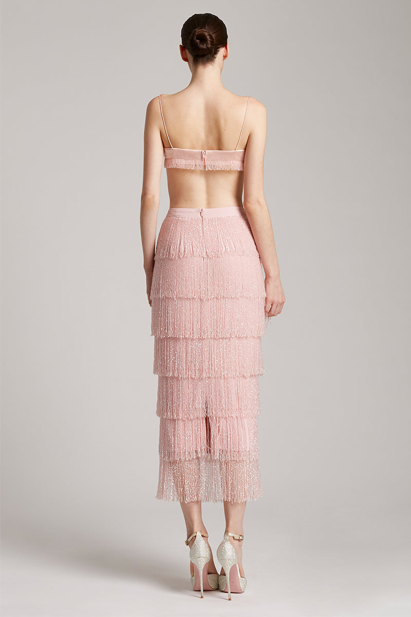 Tiered Crystal Fringe High Waisted Skirt in Blush Pink