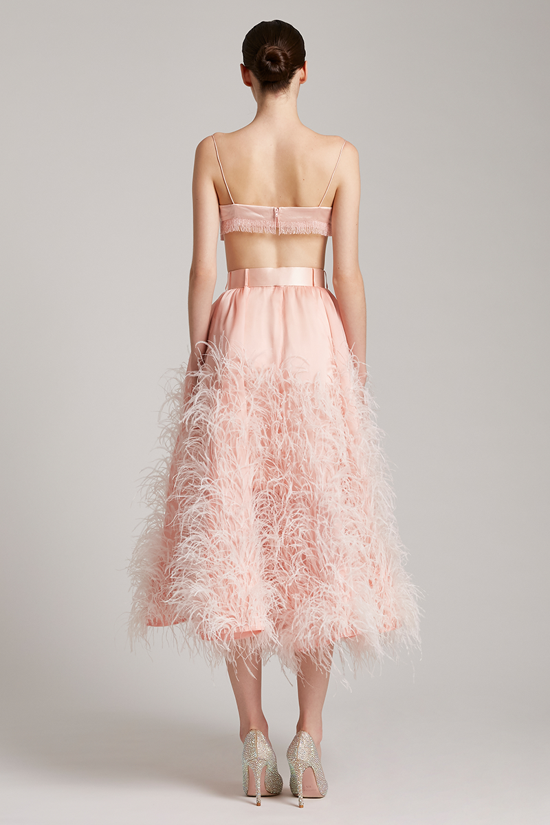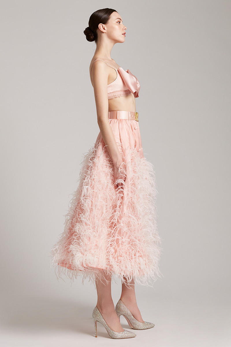 Fully made in lustrous silk satin, the Ariana Big Bow Crystal Fringe Silk Satin Bralette in Blush Pink features an alluring oversized bow design and a crystal fringe trim that shimmers and sways as you move. The bare neckline perfectly makes way for your favorite necklaces and the built-in padding sits pretty on the bust, so no bra is needed. A head turner with delicate detailing, this statement piece will have you channeling your inner Diva whenever you put it on.