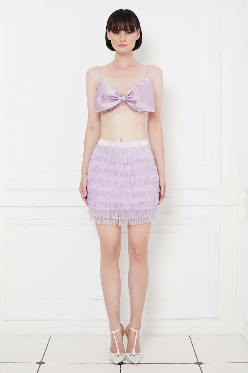 Ariana Big Bow Crystal Fringe Silk Satin Bralette in Lilac