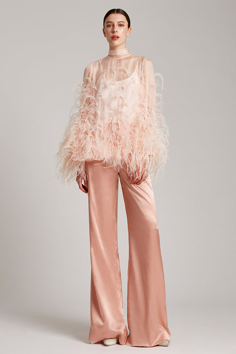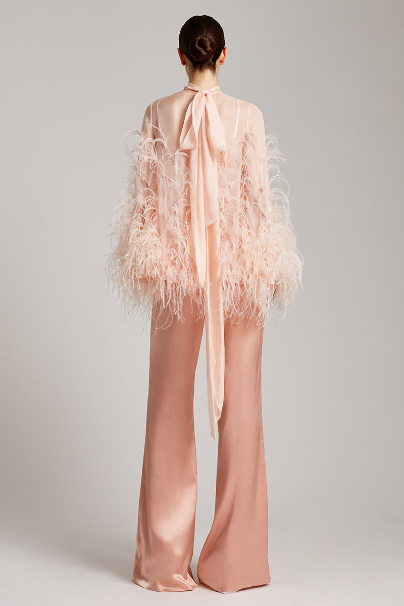 The Ostrich Feather Embellished Blouse with Bell Sleeves in Baby Pink is truly ethereal. In a sheer silk chiffon, this floaty blouse features a tented shape and bell sleeves, as well as a separated silk scarf that can be tied high on the neck for an elegantly draped effect. Meticulously hand embroidered on are plush ostrich feathers and dispersed glass beads for a delicately extravagant look.