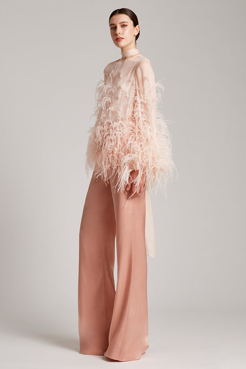 Ostrich Feather Embellished Blouse with Bell Sleeves in Baby Pink