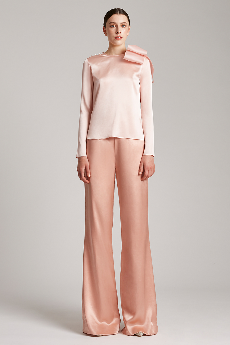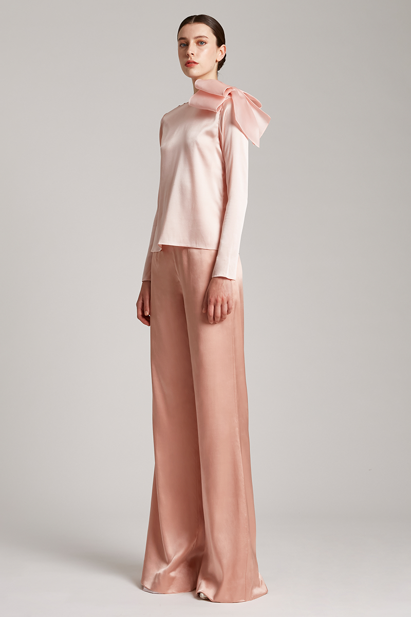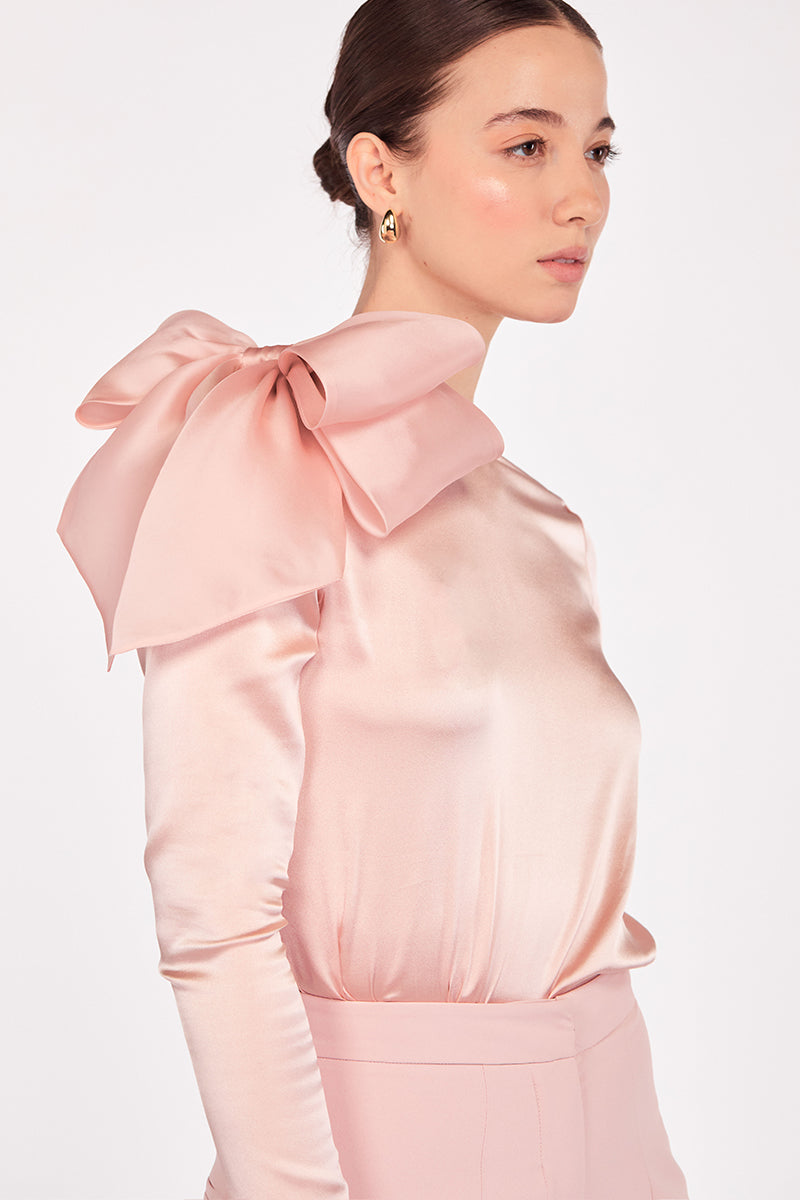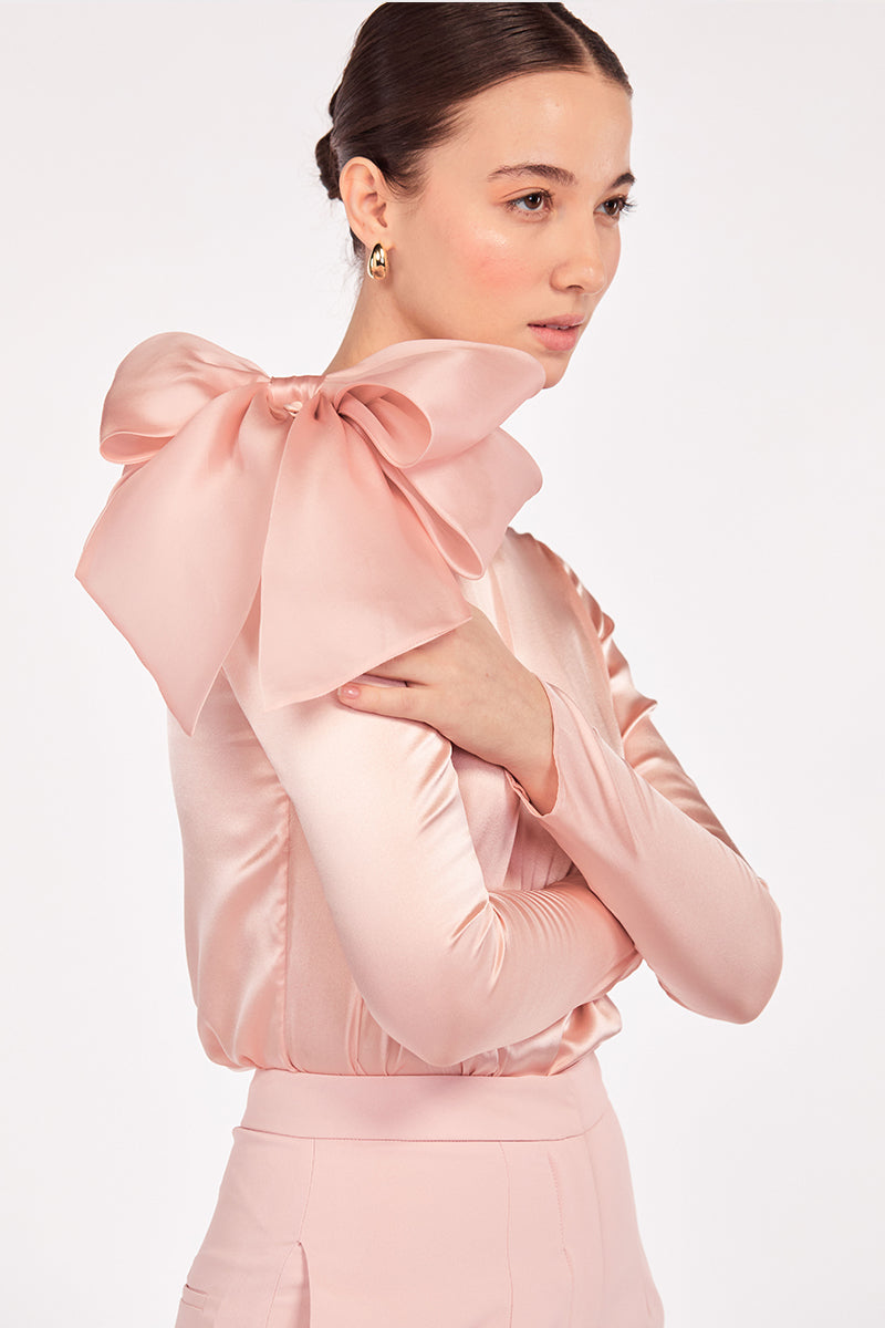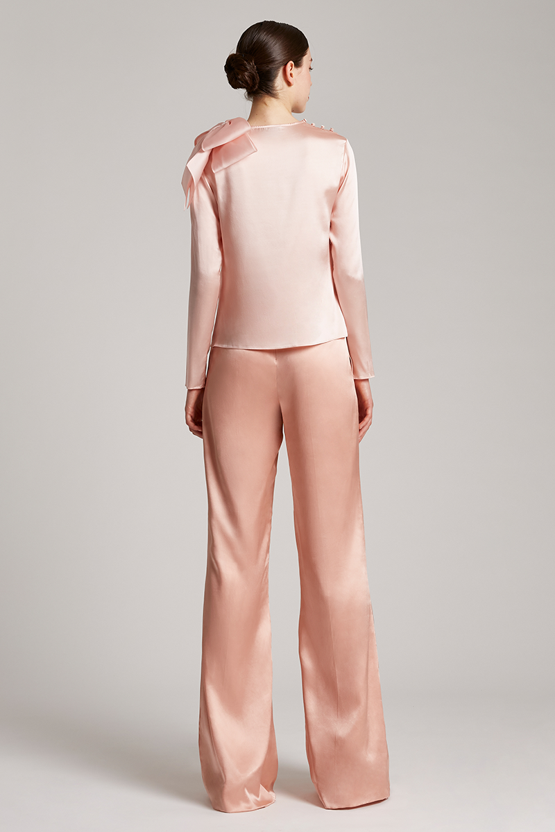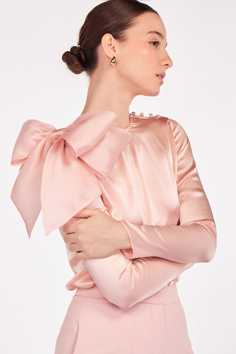 Silk Satin Button and Bow Embellished Blouse with Long Sleeves in Blush Pink