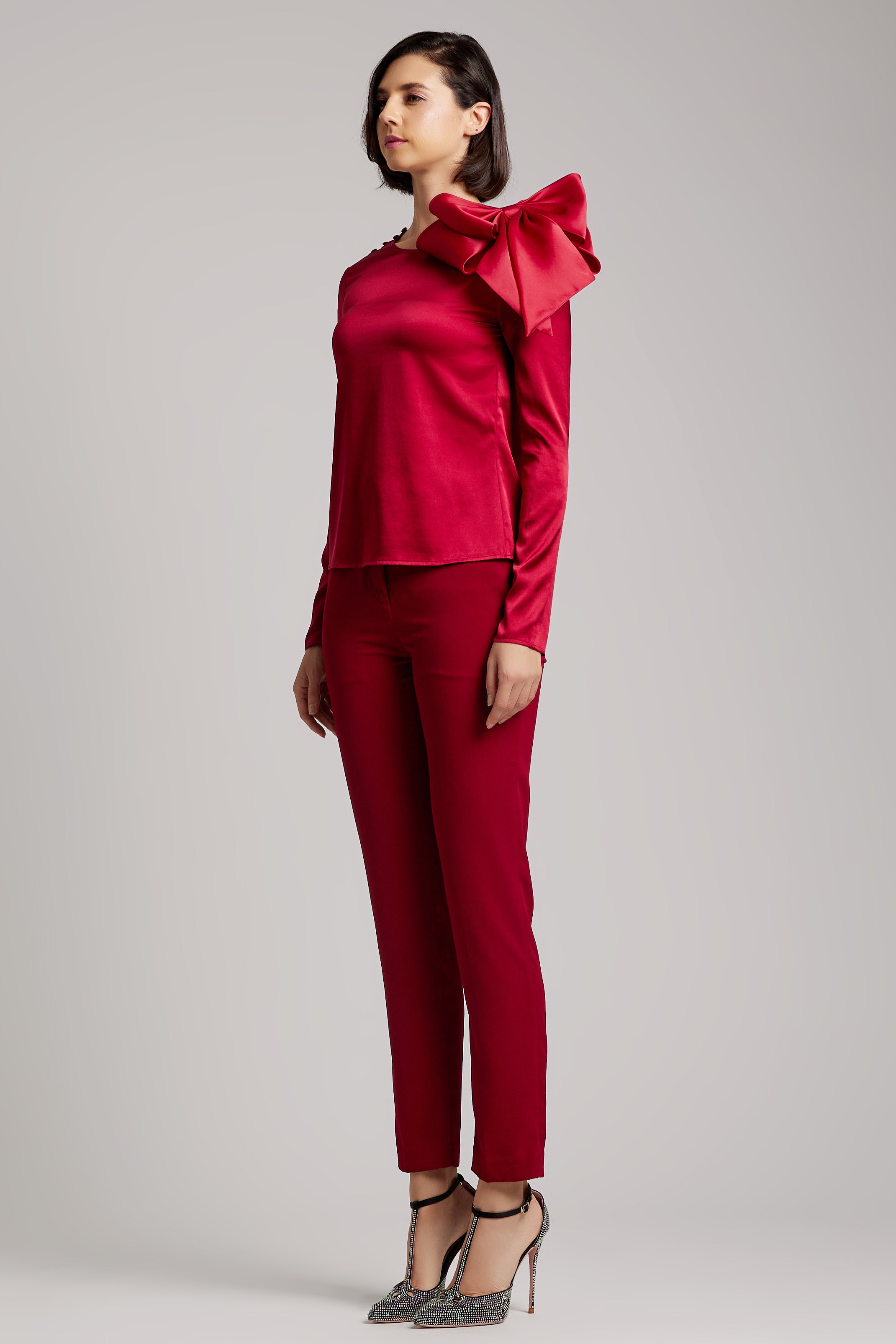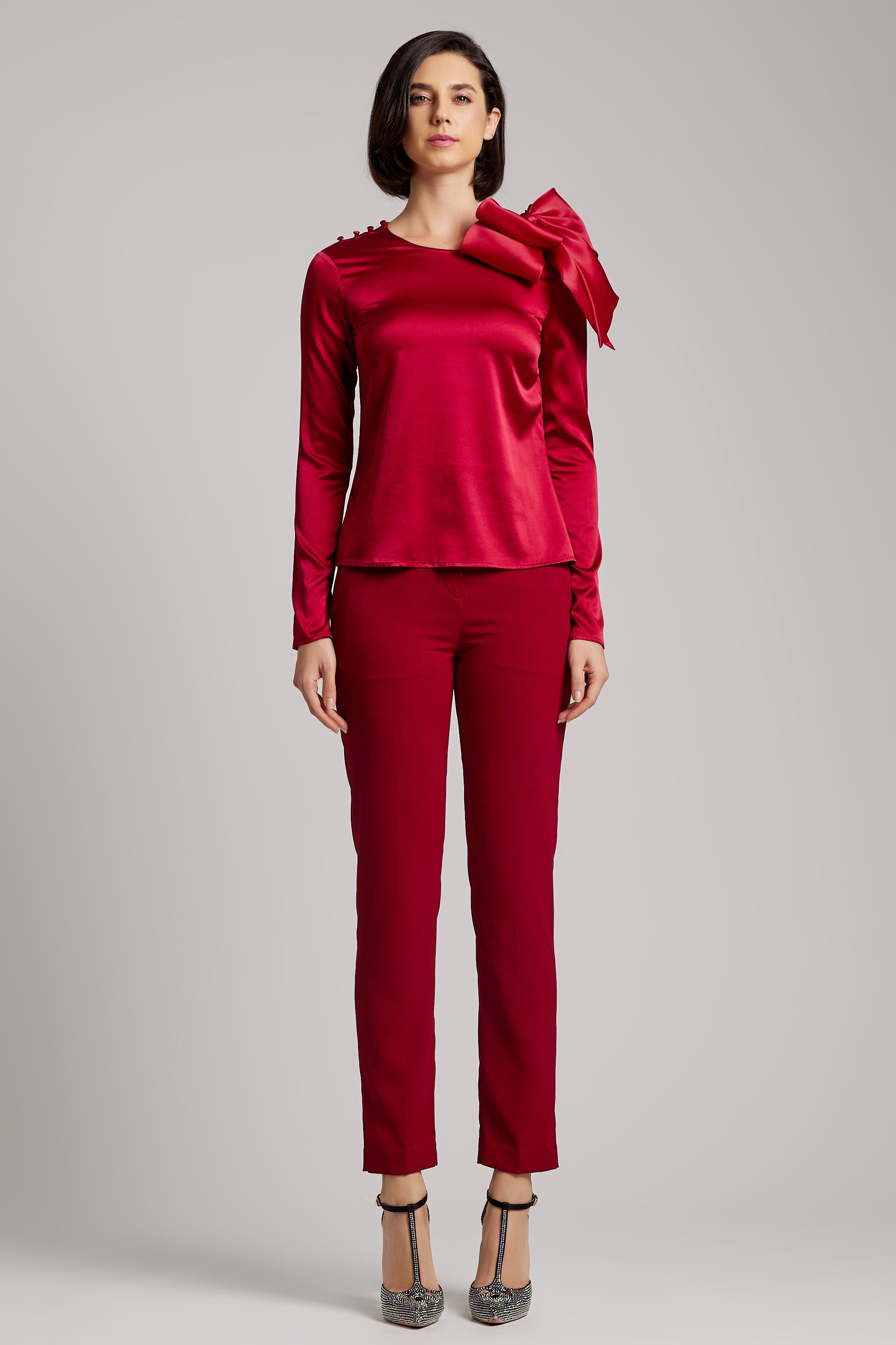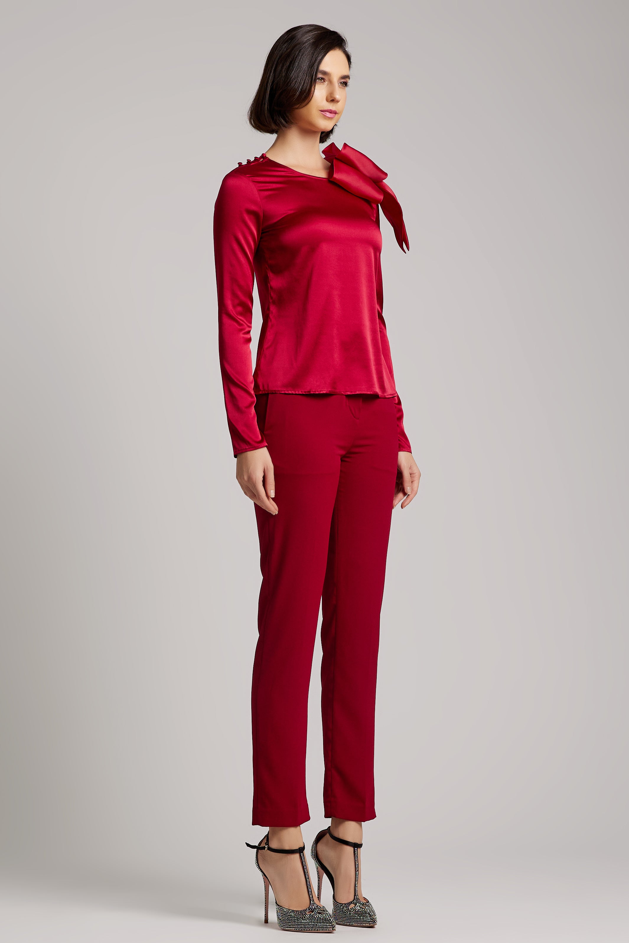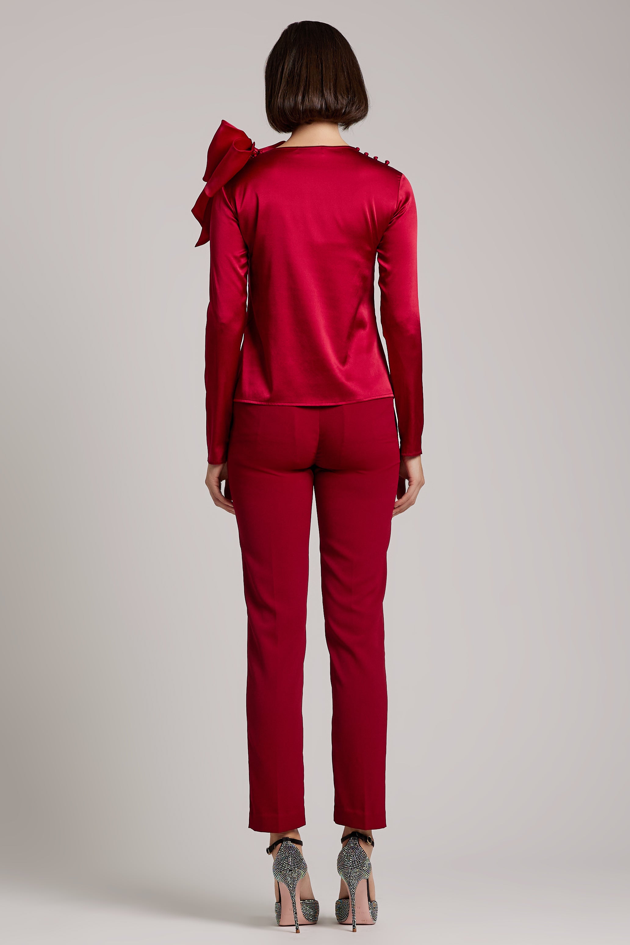 Silk Satin Button and Bow Embellished Blouse with Long Sleeves in Maroon