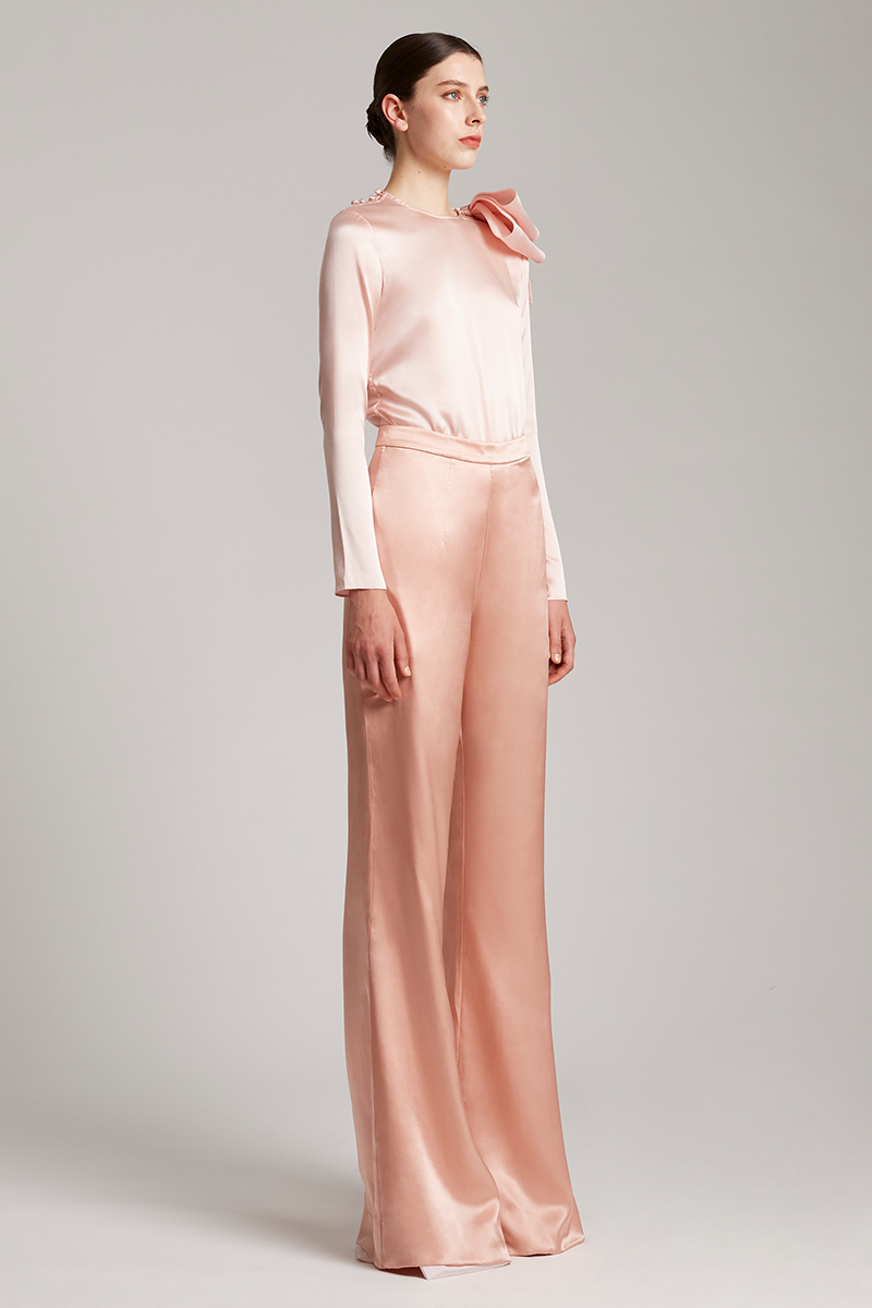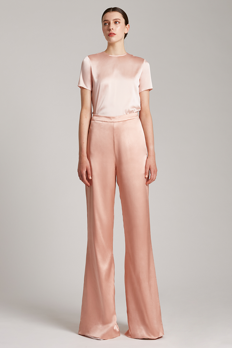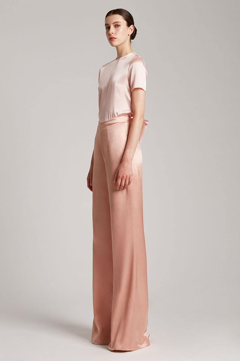 Silk Satin Wide Leg High Waisted Trousers in Rose Gold