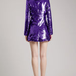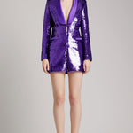 Sequin Embellished Coat Dress with Silk Satin Lapels in Purple is truly a dress made for fashion royalty with its boldly regal purple hue. The defined shoulder and boxy shape sets the stage for the embroidered sequins and the luxurious silk satin lapels, resulting in nothing less than a mesmerising visual extravaganza. Pair with a pair of black trousers or the coordinating sequin embellished shorts for maximum effect.