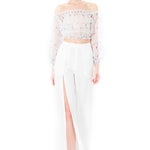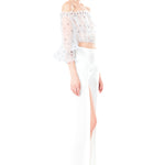 A step-up from traditional wide leg trousers, the Side Slit High Waisted Trousers in White comes in a flawless snow-white hue with a thigh-high front slit on its right pant leg. The silhouette is light and airy thanks to its silk crepe base fabric, giving the piece its graceful skirt-like appearance. It is cut to sit flatteringly high on your waist and features a column of ornamental buttons before connecting to the pant leg opening.