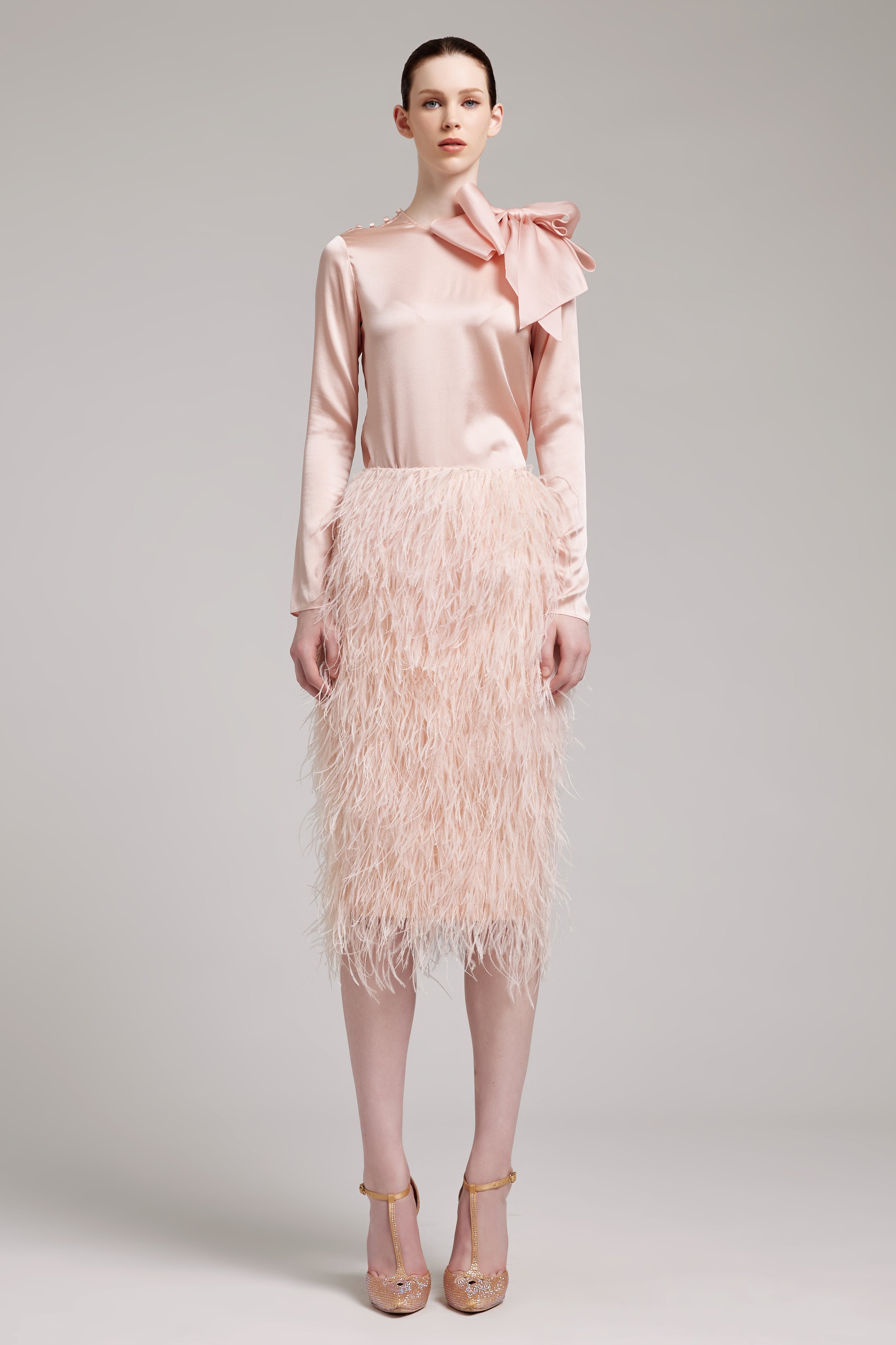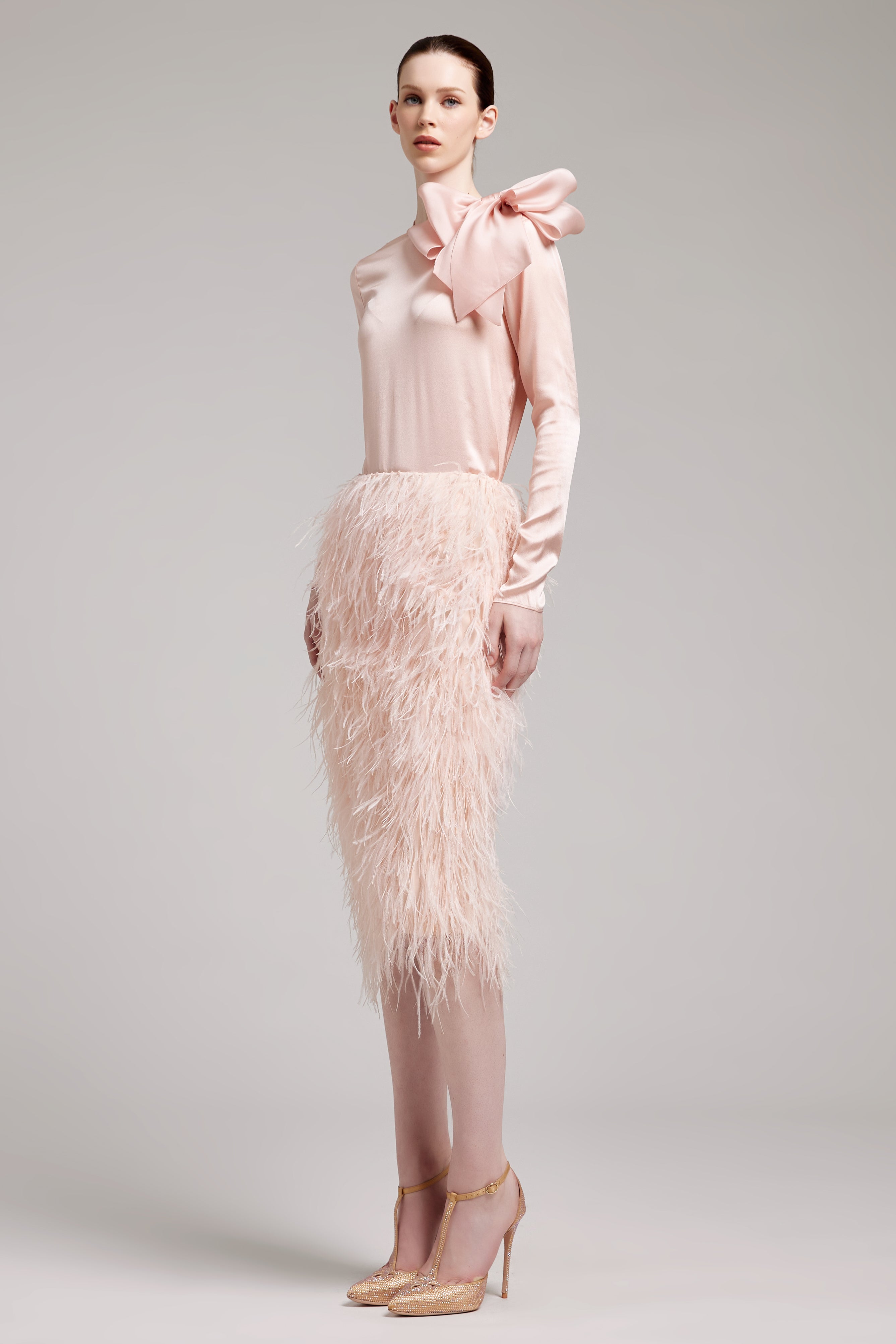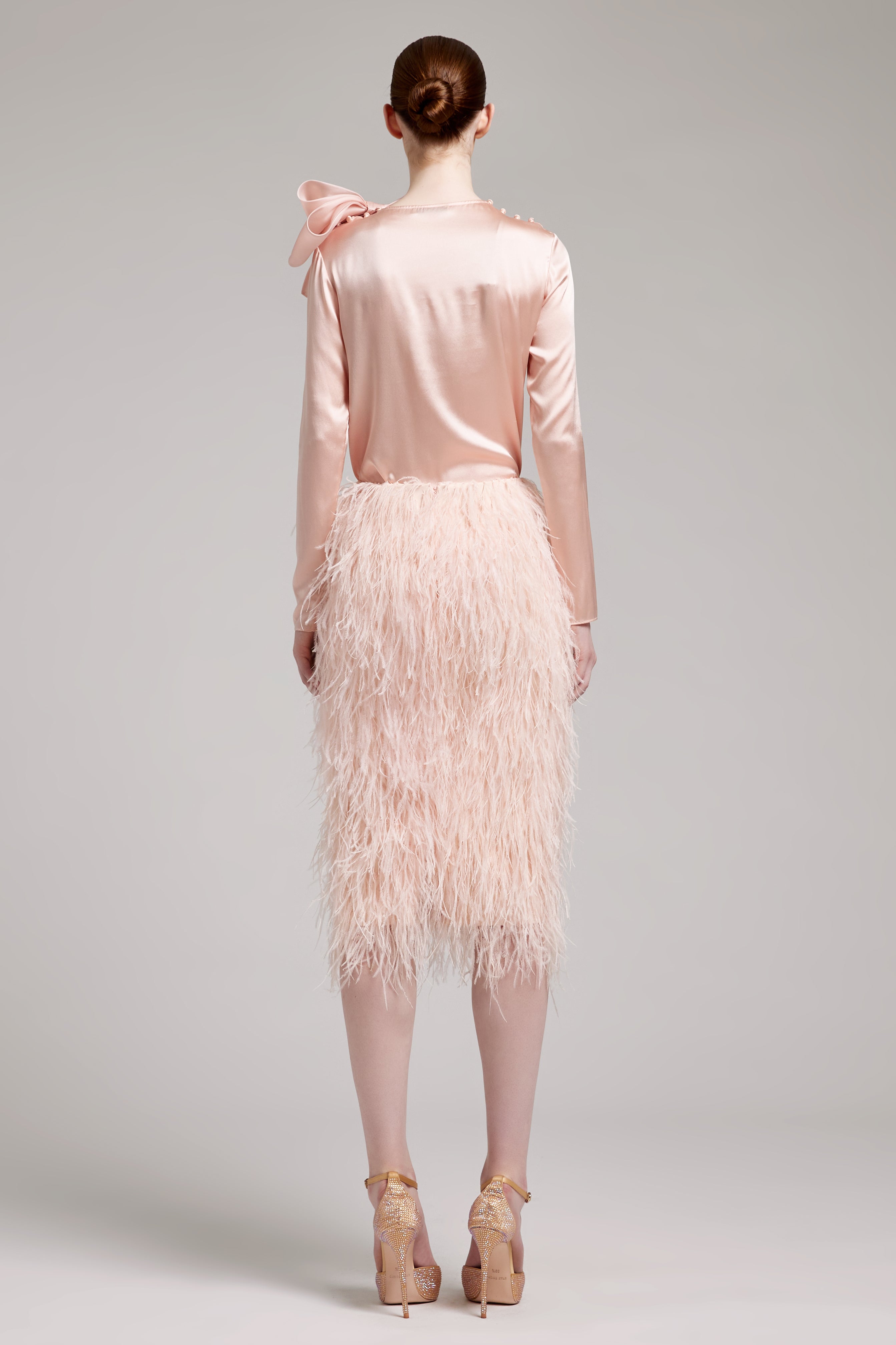 Ostrich Feather Embellished High Waisted Skirt in Baby Pink