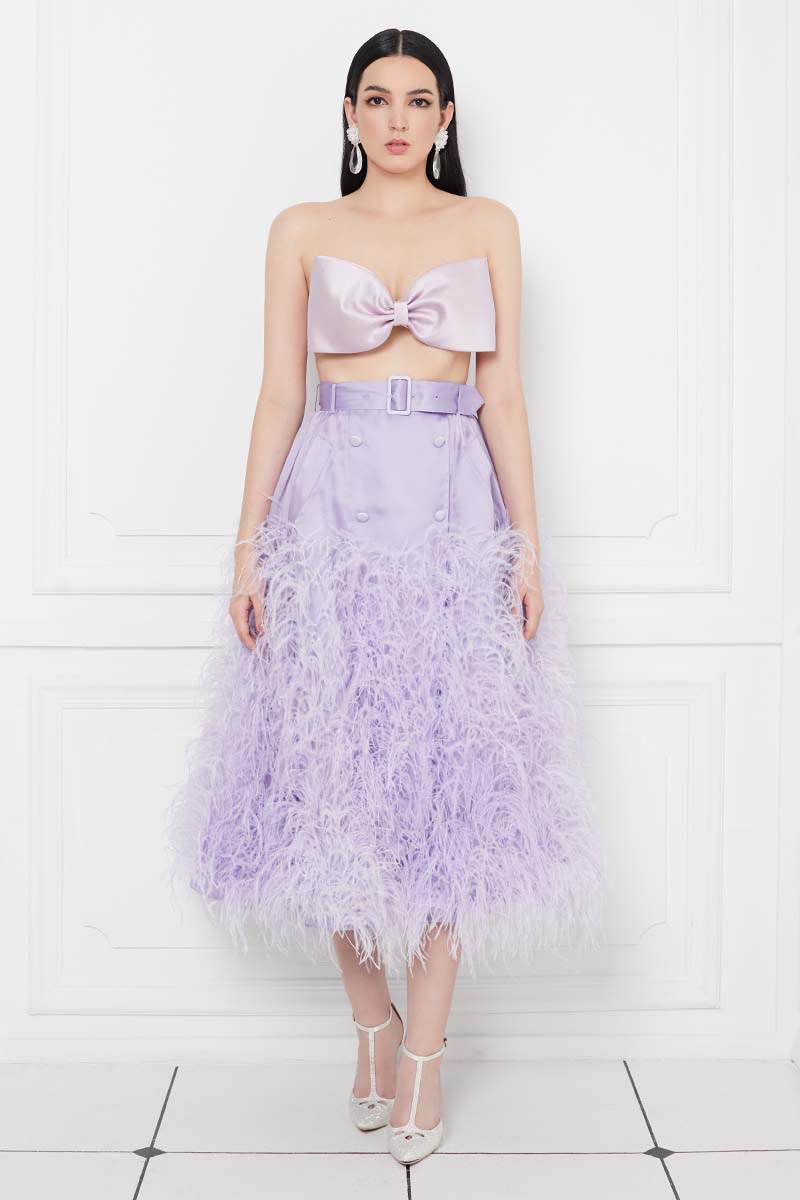 Ostrich Feather Embellished Silk Gazar Skirt in Lilac