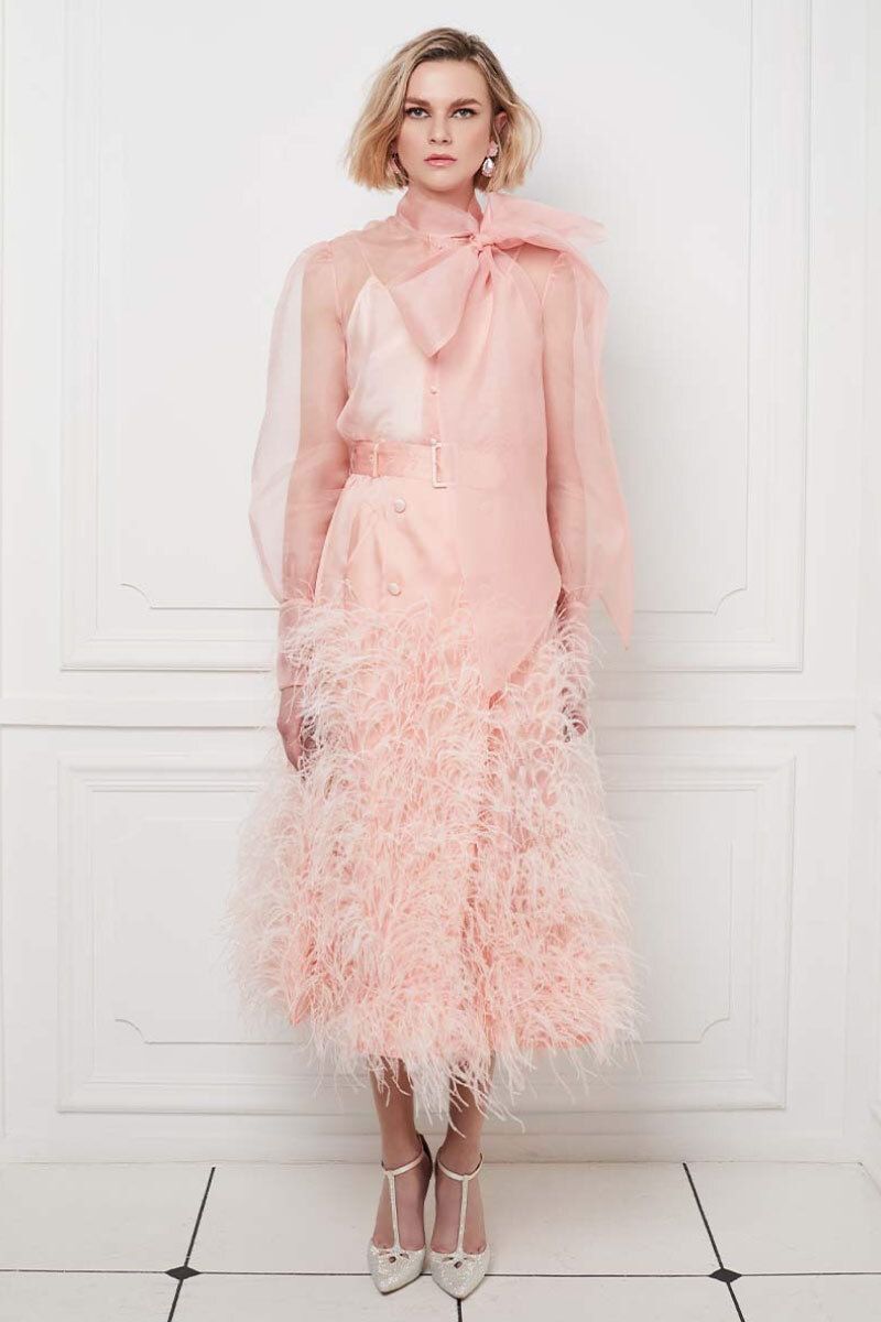 The Ostrich Feather Embellished Silk Gazar Skirt in Pink elicits infinite prestige and a sense of omnipotence. Adding to the supreme design is a generous body of matching lush ostrich feathers that highlight the soft flowy aspect of the skirt, allowing your movement to take place graciously. Sitting high on the waist, it comes with a detachable silk belt to pair seamlessly with any top tucked in.