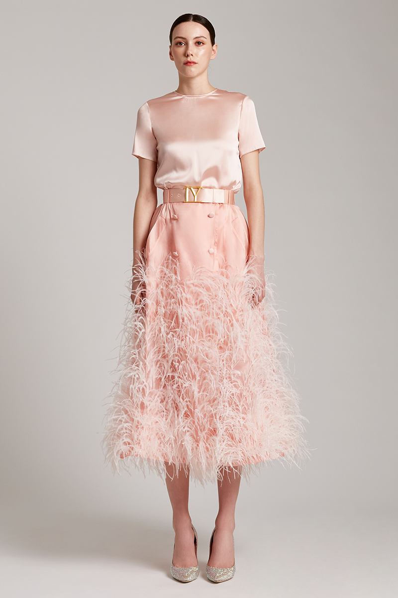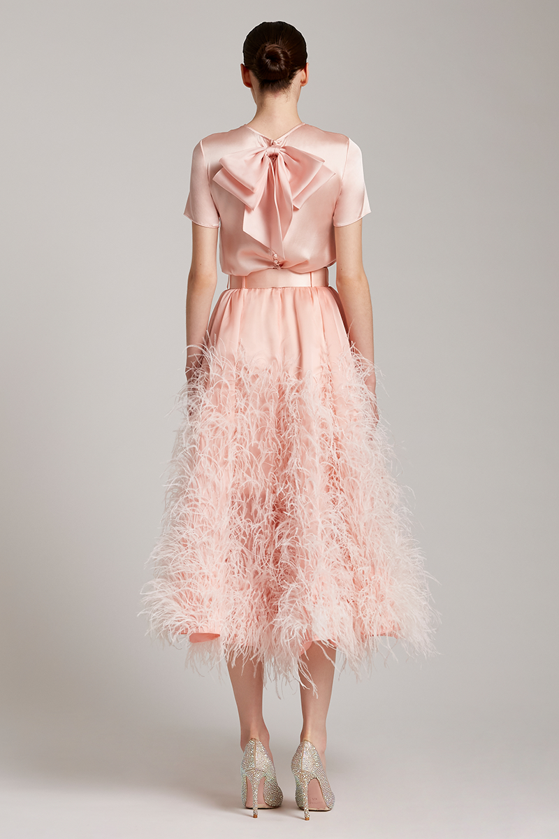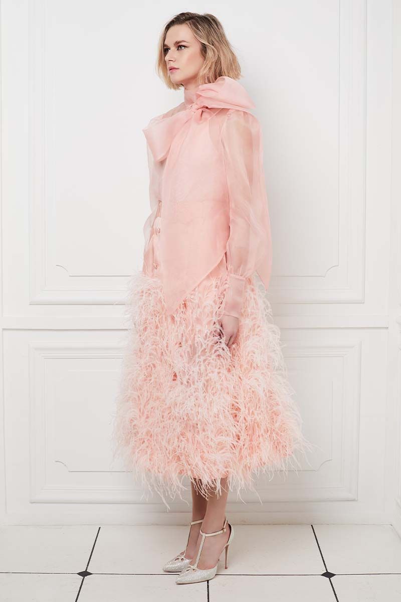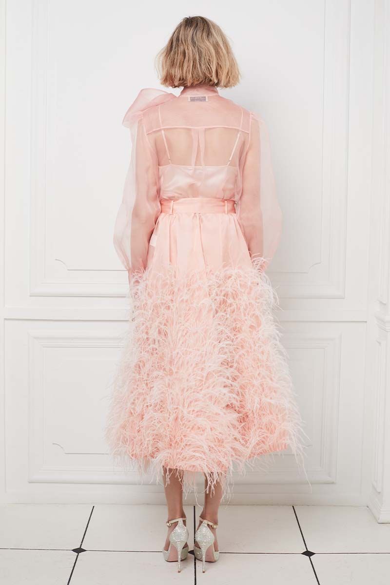 Ostrich Feather Embellished Silk Gazar Skirt in Pink